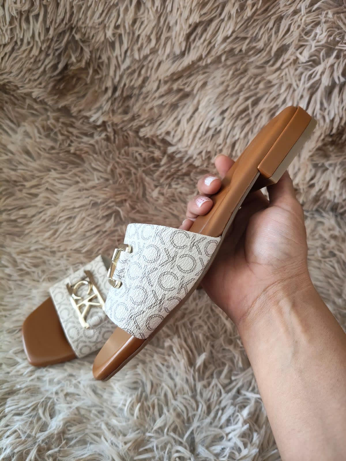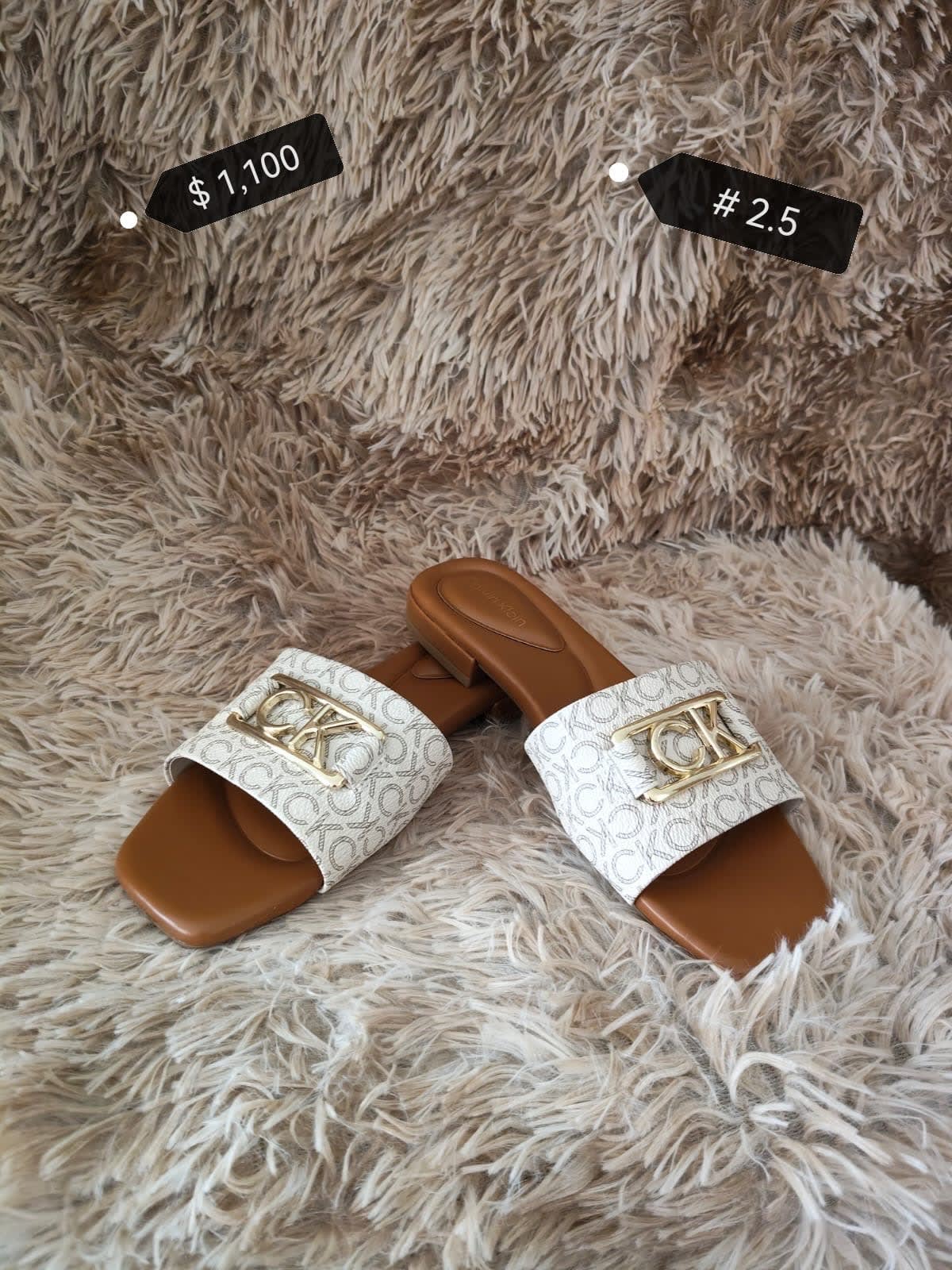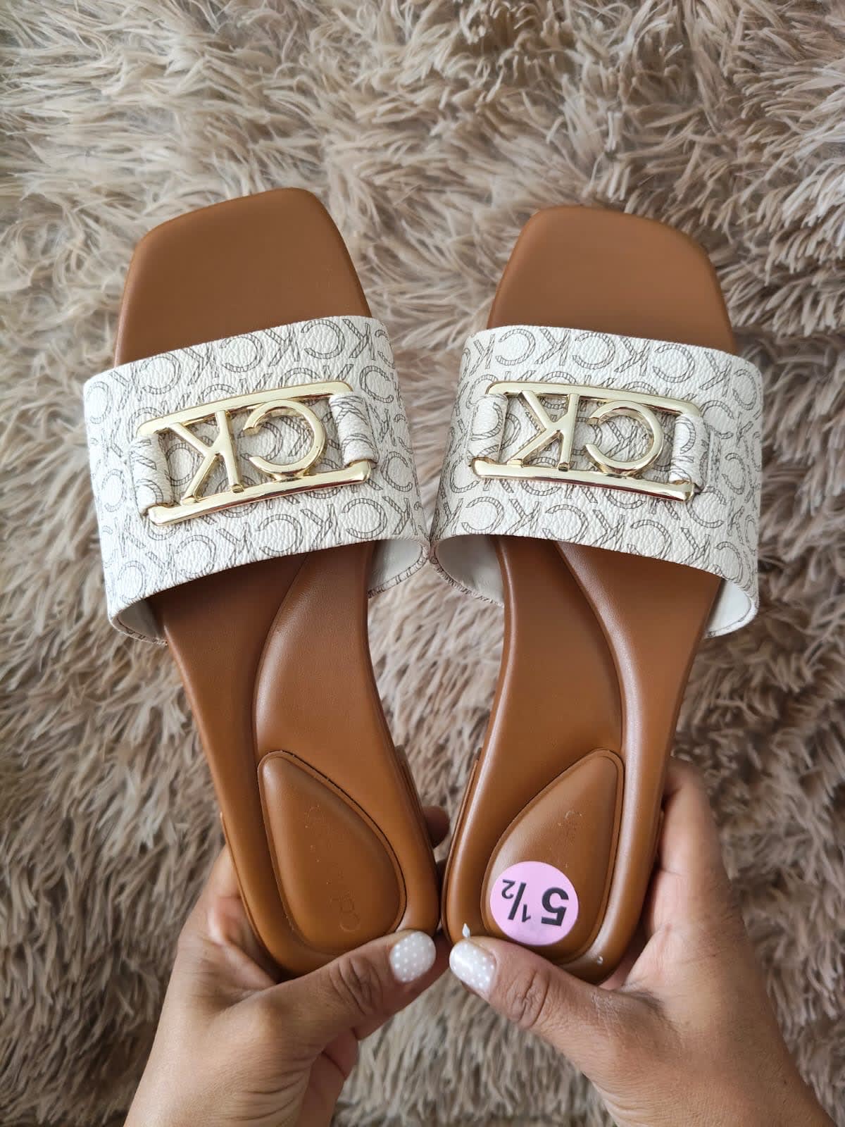 Sandalias de la marca Calvin Klein en color blanco y marrón. Tienen un diseño elegante con detalle metálico en la parte frontal. Nuevas .