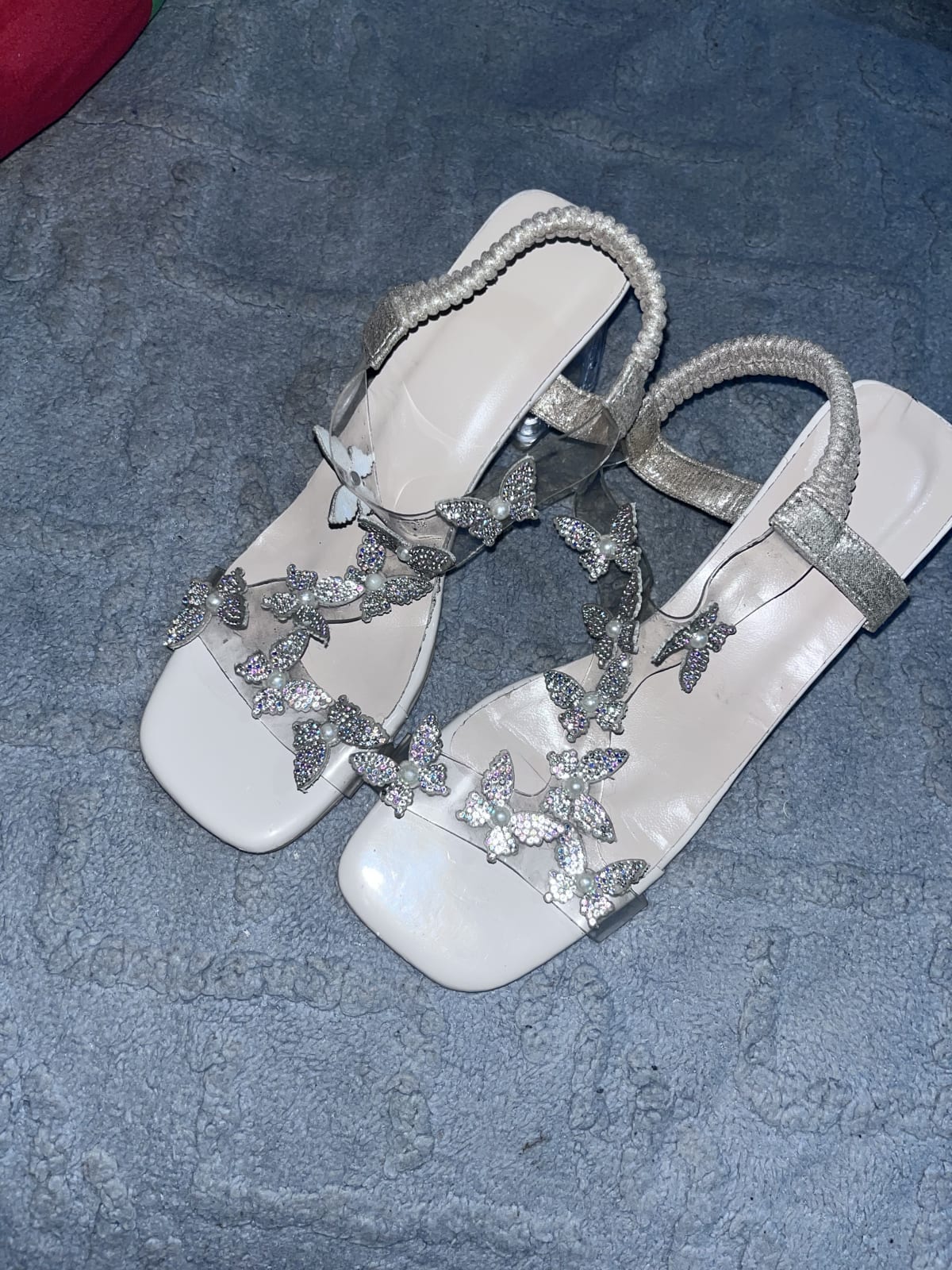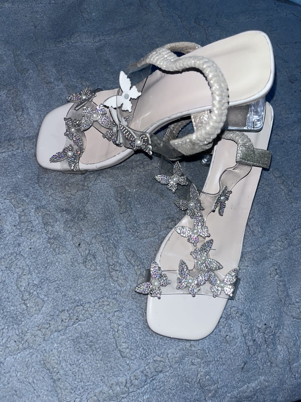 Hermosas sandalias de tacón con detalles brillantes en forma de mariposa. Están en buen estado, con algunos signos de uso visibles en la suela. Ideales para ocasiones especiales o salidas nocturnas. Incluyen un diseño elegante y cómodo, perfectas para complementar cualquier atuendo.