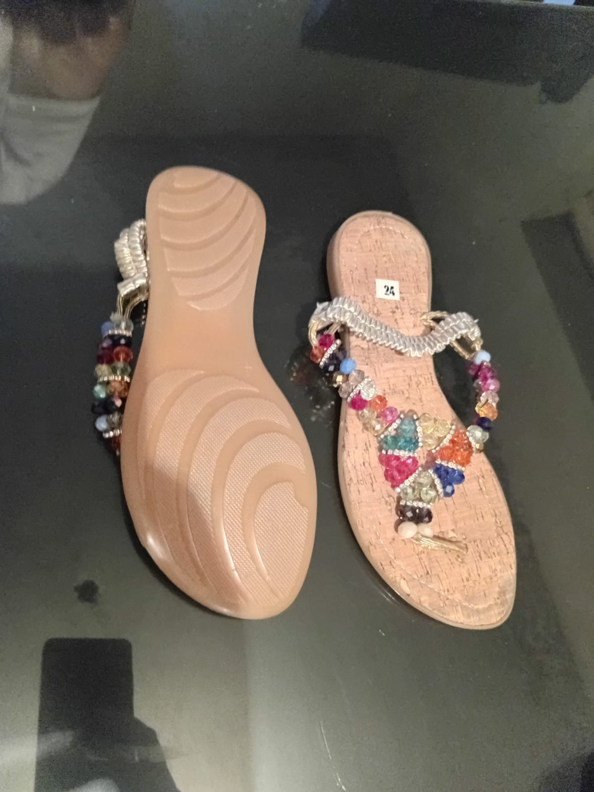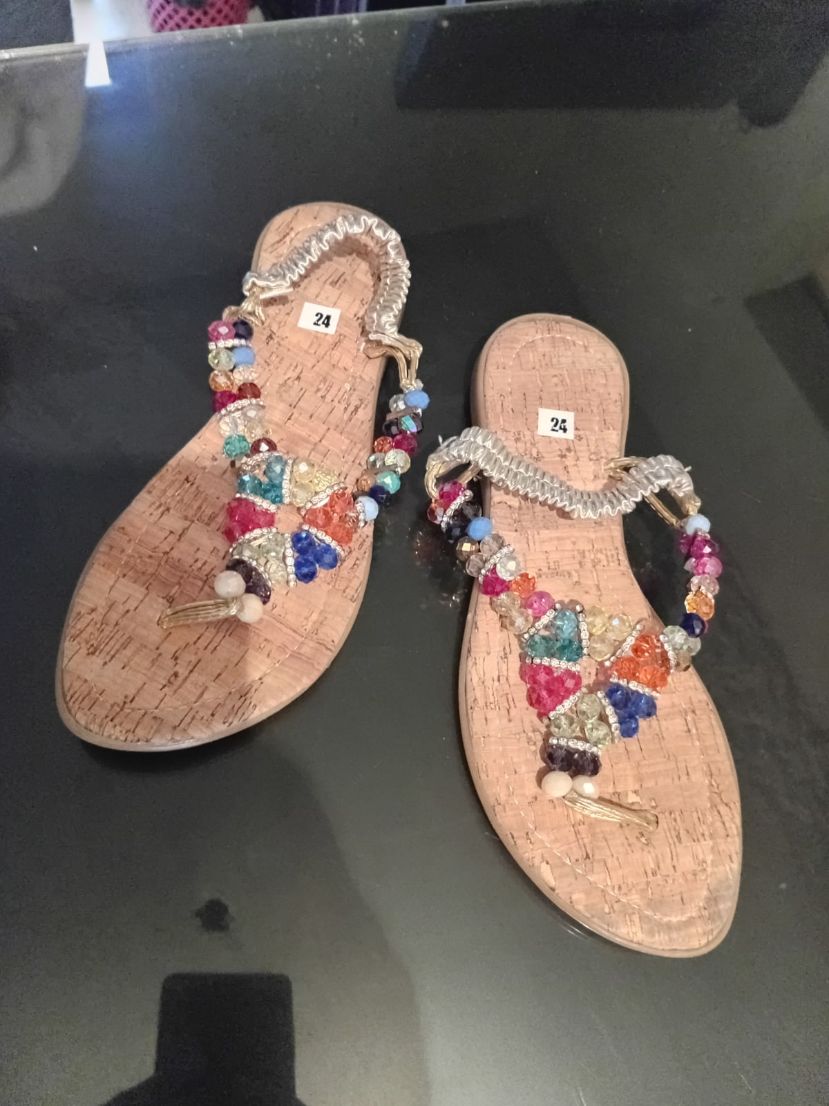 Estas sandalias de verano son perfectas para días soleados. Tienen un diseño colorido con cuentas brillantes y una suela de corcho. En buen estado, sin defectos visibles. Talla 24.