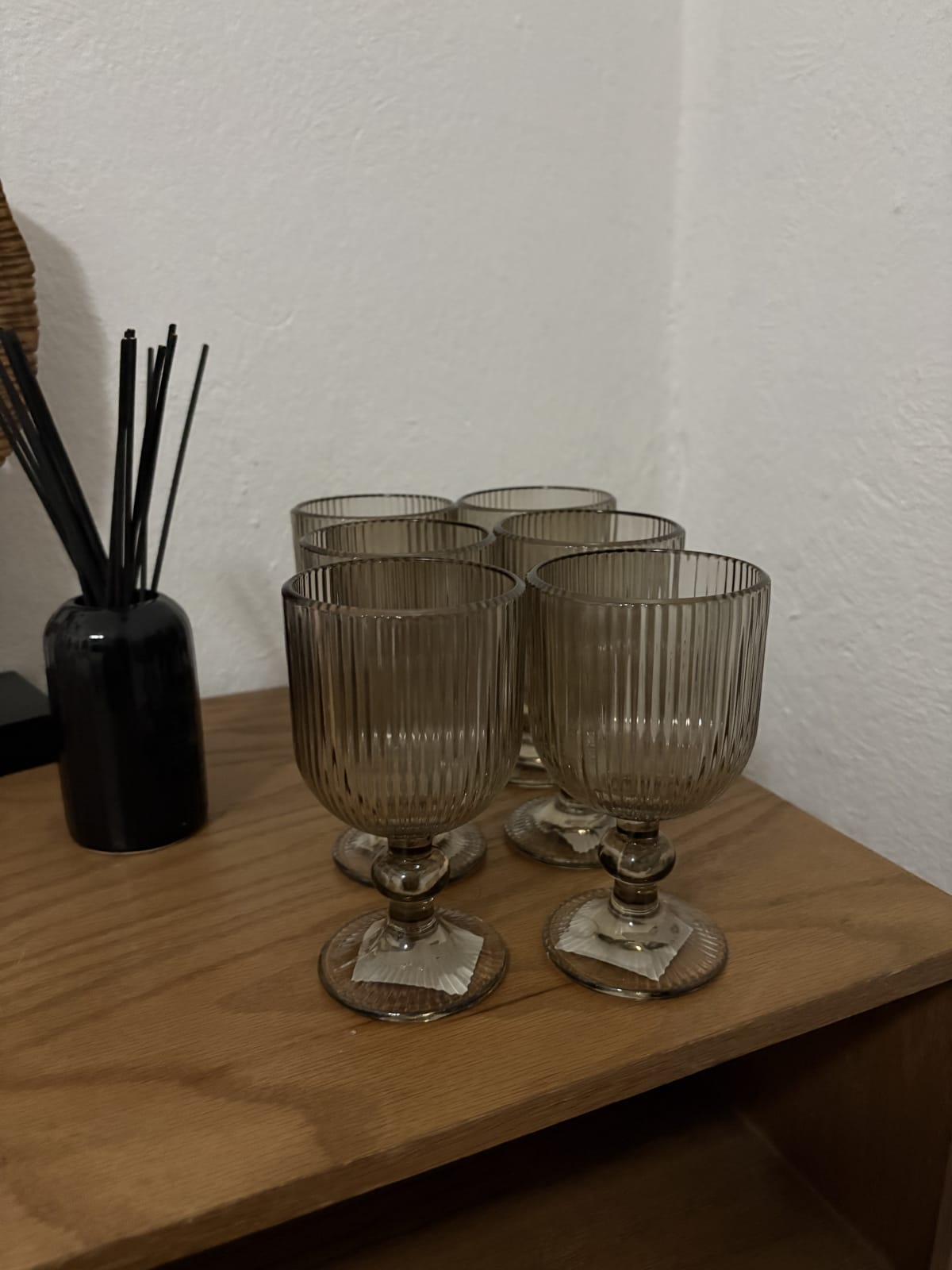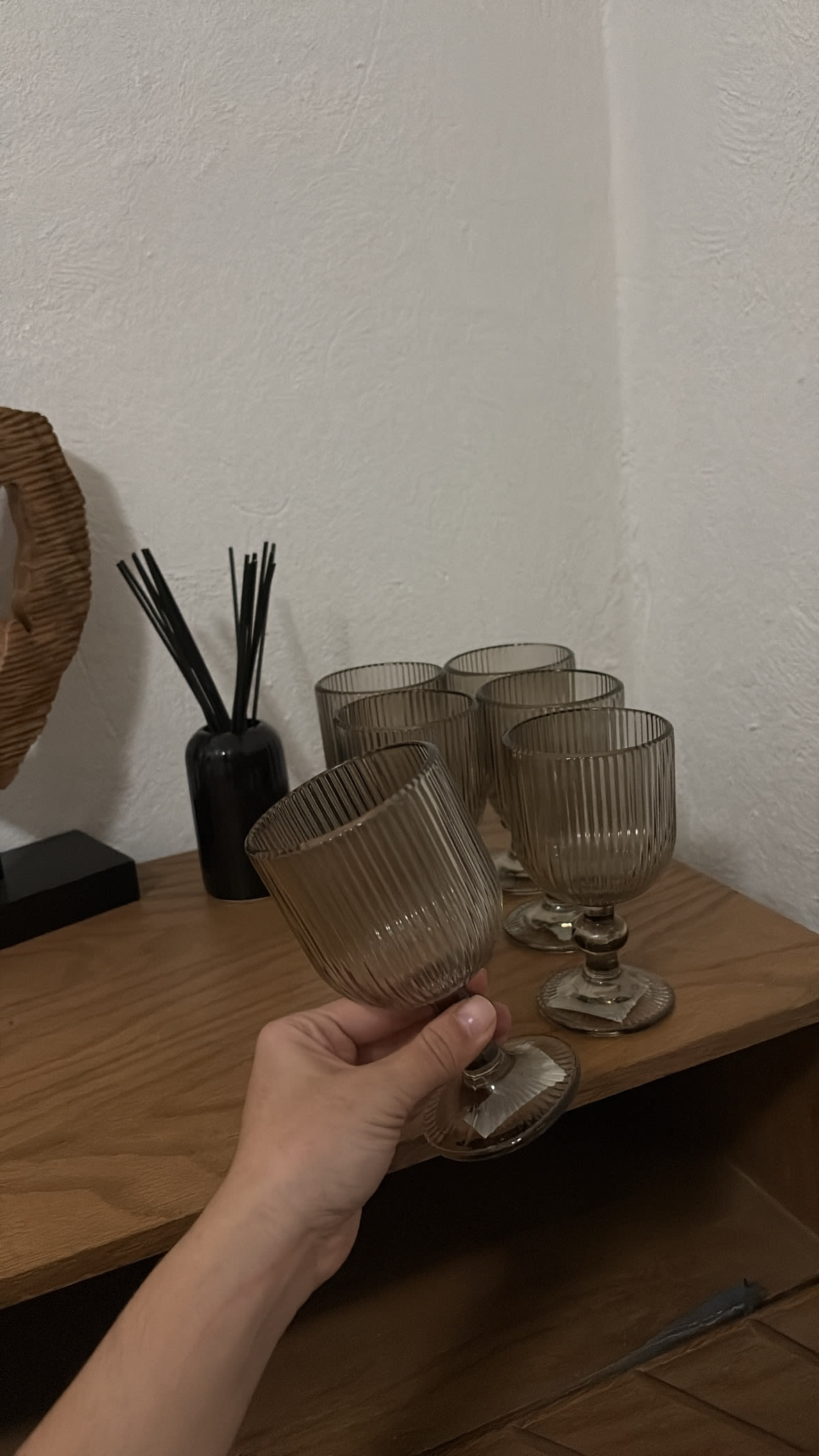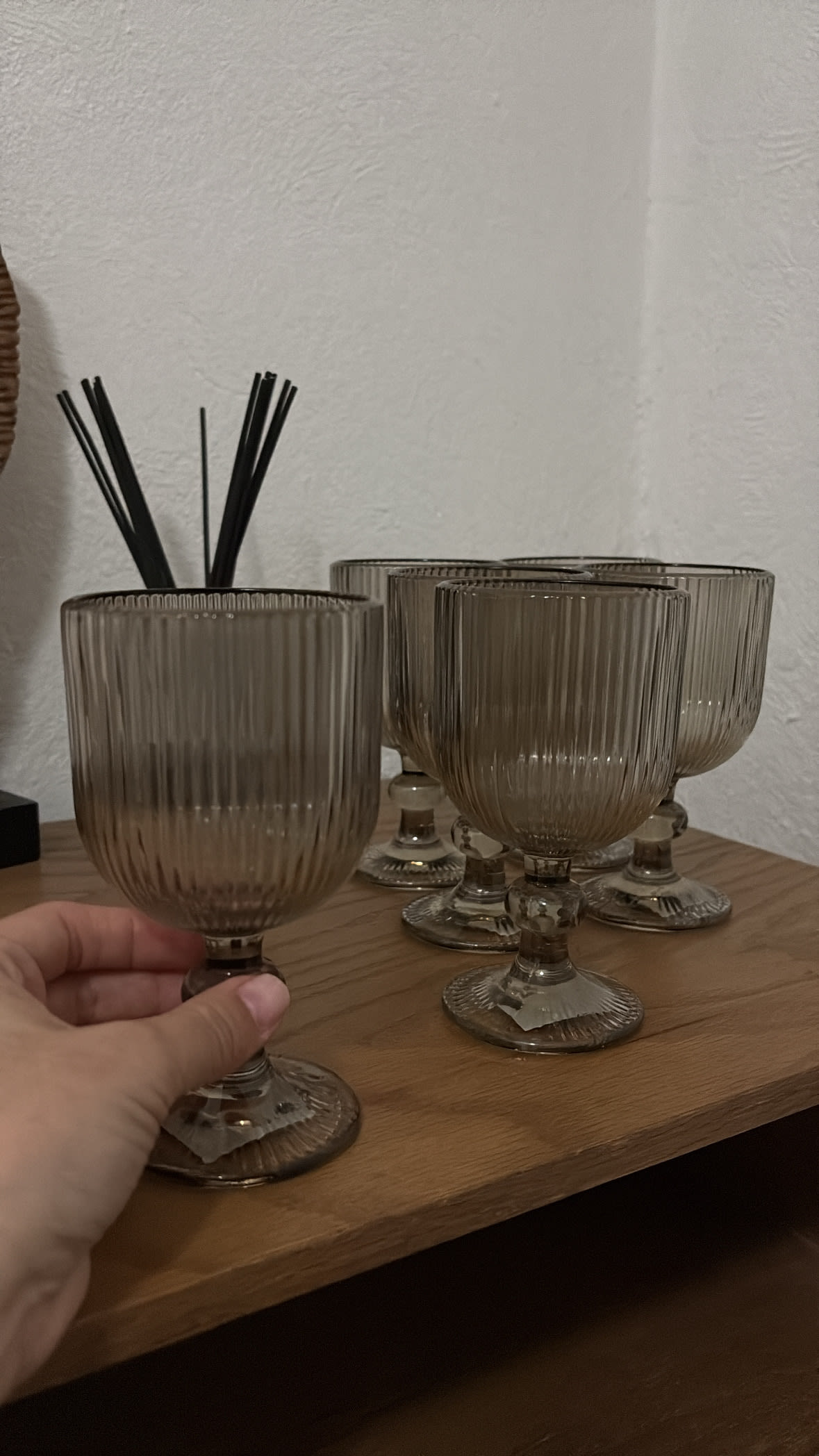 Este set incluye 6 copas de vidrio ahumado con diseño estriado, perfectas para cualquier ocasión.