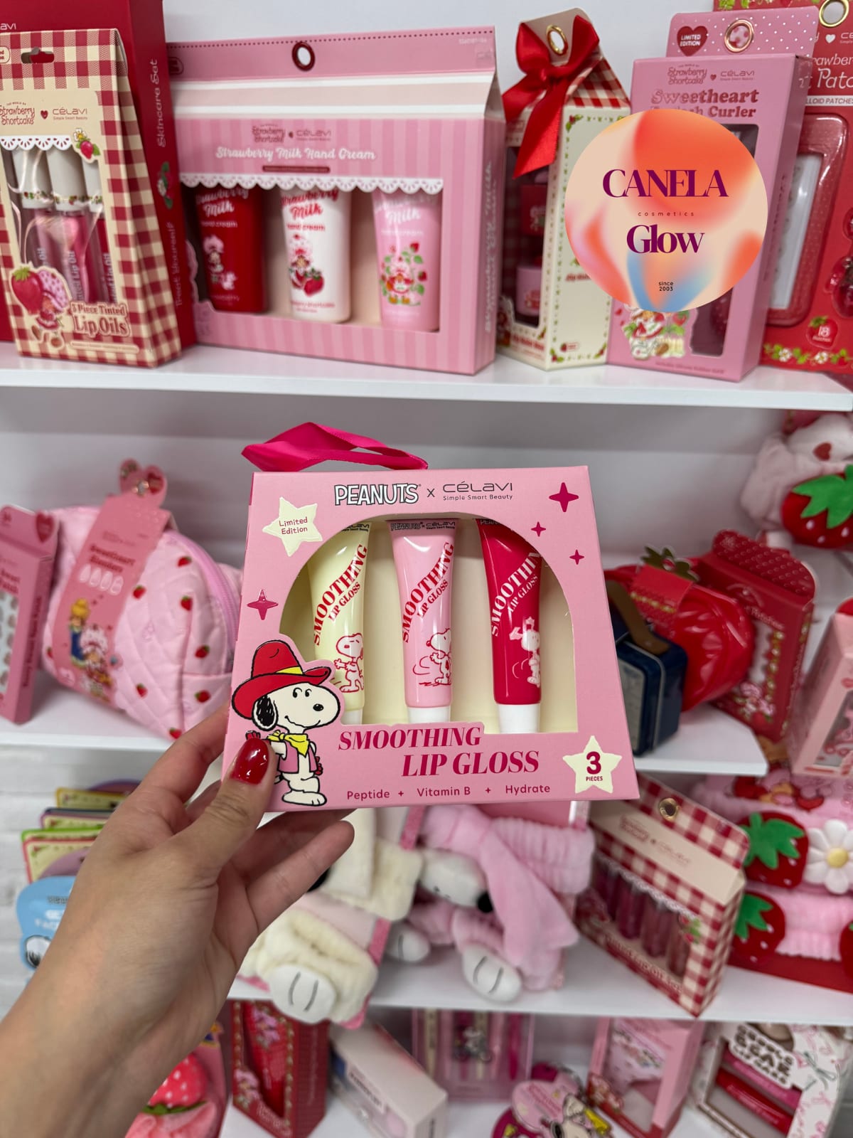 Este set incluye 3 brillos labiales de la colección Peanuts x CélaVi. Cada brillo está formulado con péptidos y vitamina B para hidratar tus labios. El empaque es colorido y atractivo, ideal para coleccionistas o como regalo. Producto nuevo y sin abrir.