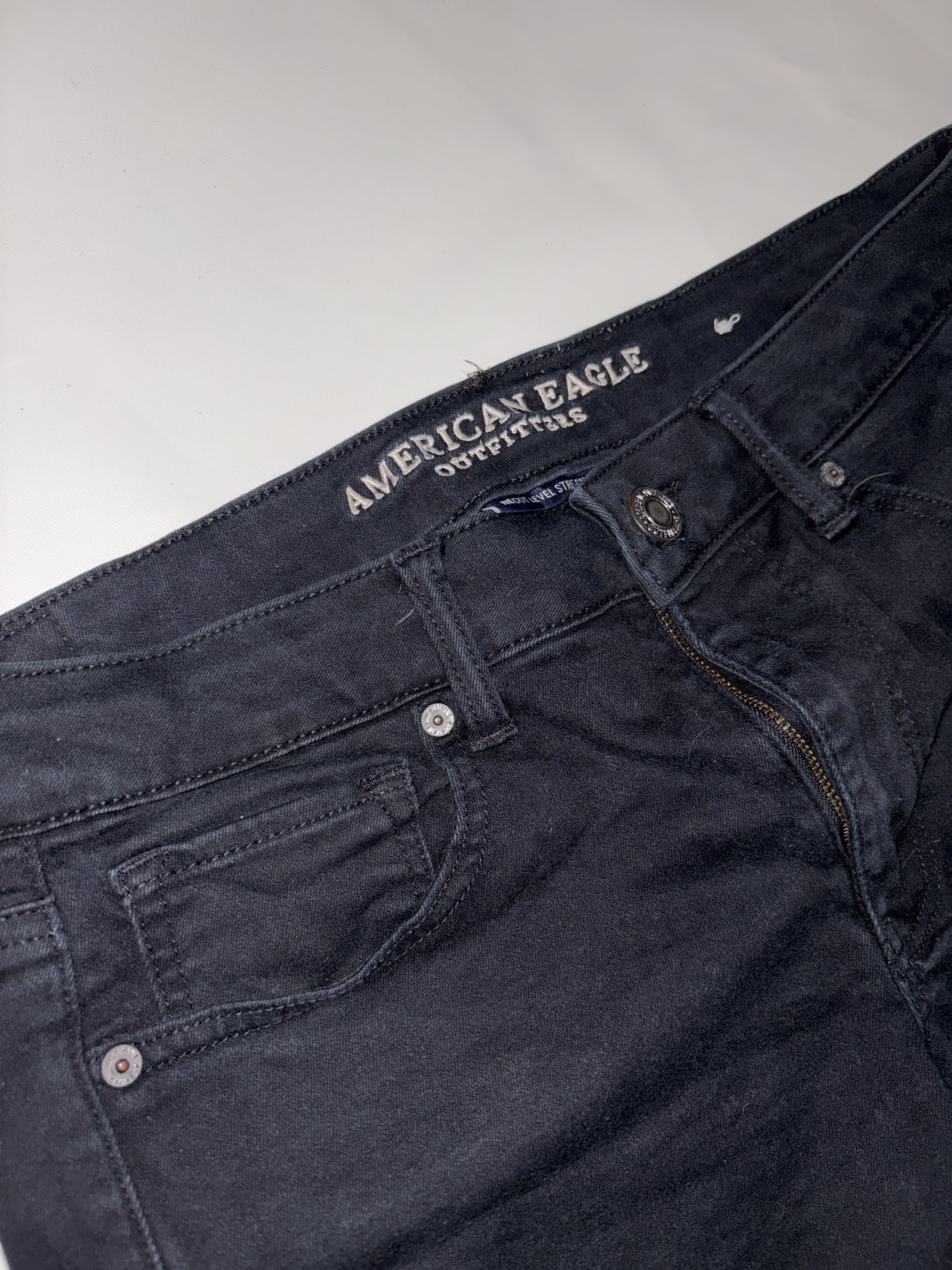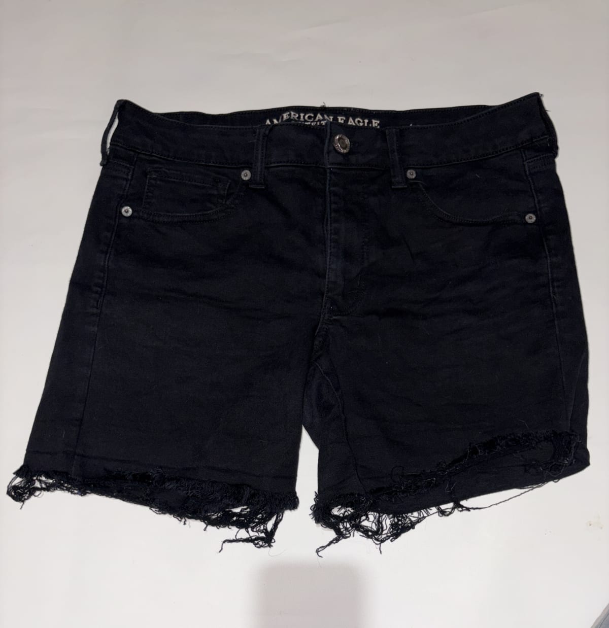 Shorts de mezclilla en color negro de la marca American Eagle. Tienen un diseño con dobladillo deshilachado y están en buen estado general, con algunas señales de uso. Ideal para el verano o para un look casual. No incluye accesorios adicionales.