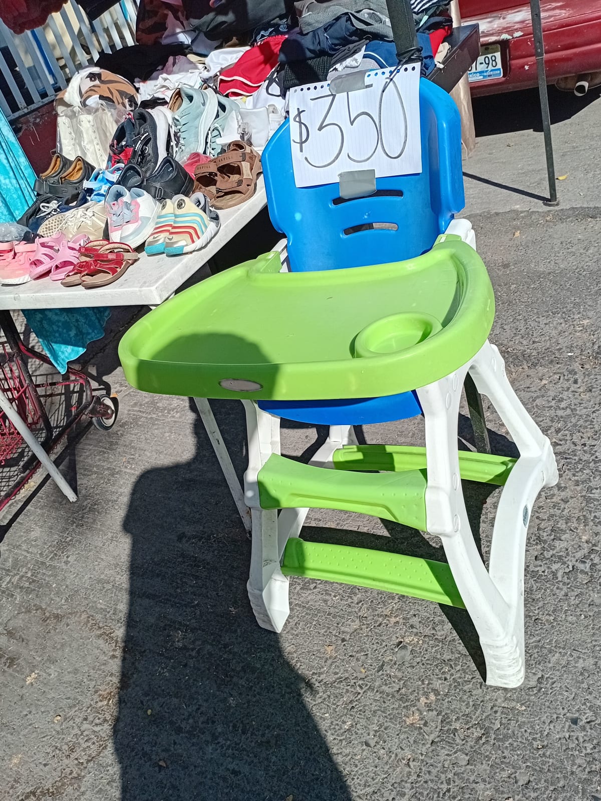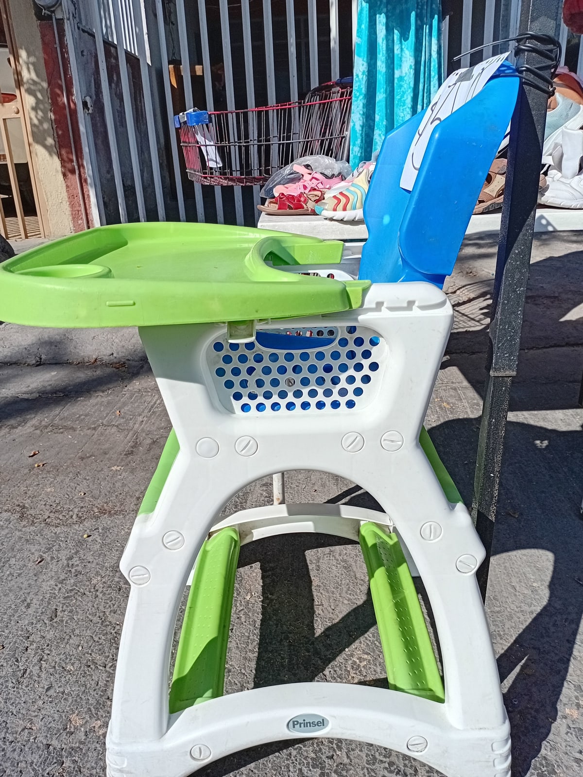 Silla alta para bebé en buen estado, ideal para alimentar a los más pequeños. Cuenta con bandeja extraíble y un diseño colorido en azul y verde. No presenta daños visibles, pero tiene algunas marcas de uso. Perfecta para hogares con niños pequeños.