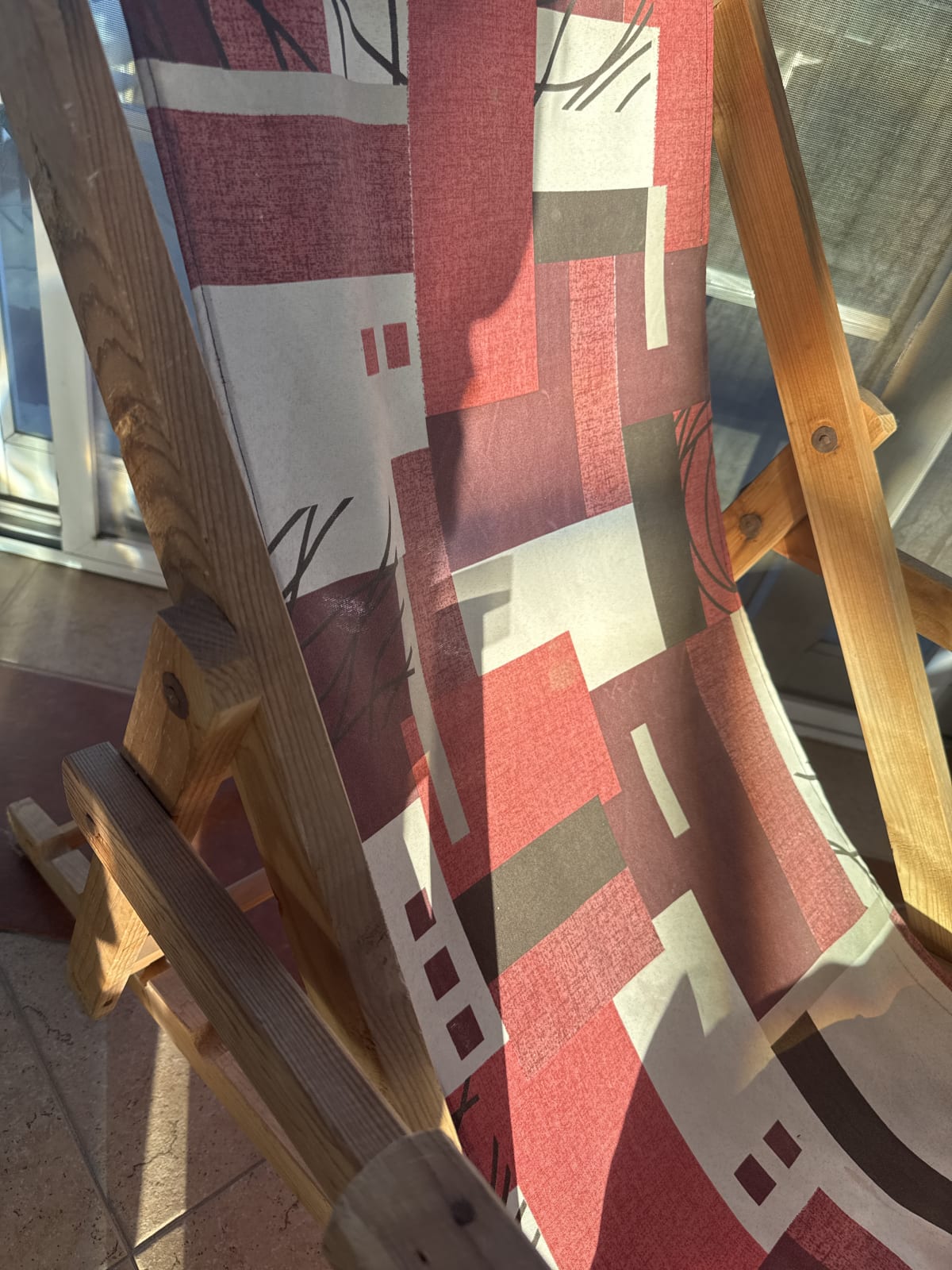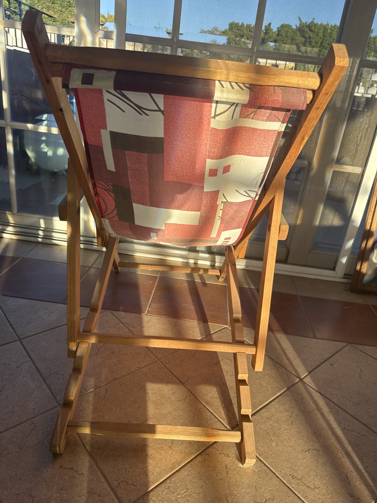 Silla de madera plegable en buen estado, ideal para interiores o exteriores. La tela presenta un diseño colorido en tonos rojos y grises, sin rasgaduras visibles. Es ligera y fácil de almacenar. Perfecta para disfrutar en el jardín o en la terraza.