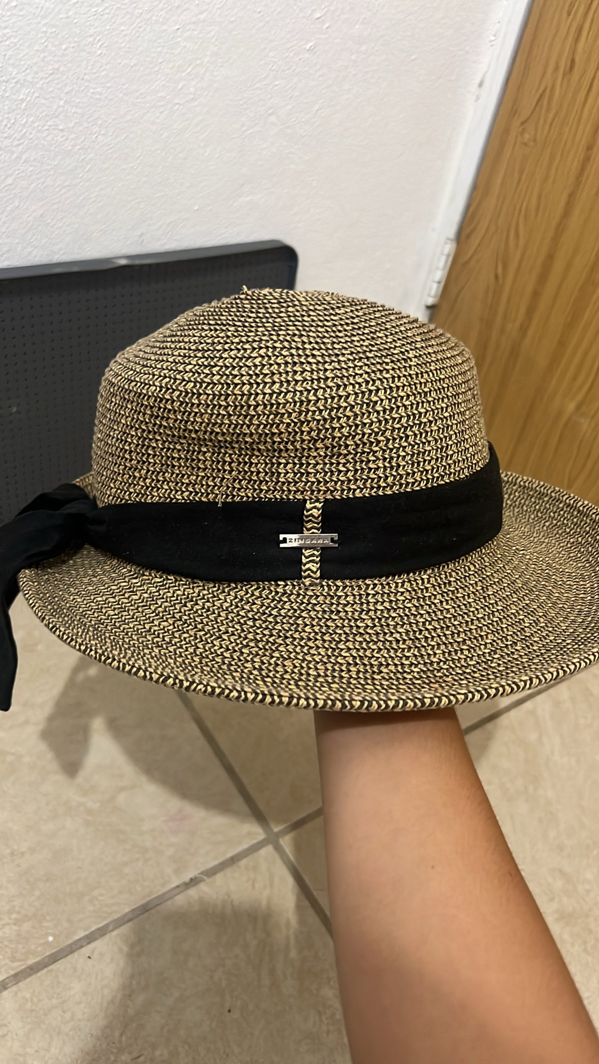 Sombrero de playa Zíngara en condición como nuevo, ideal para días soleados. Presenta un diseño elegante con cinta negra y detalles en color natural. Sin manchas ni daños visibles, perfecto para complementar tu atuendo de verano. Incluye la cinta original, lista para usar.
