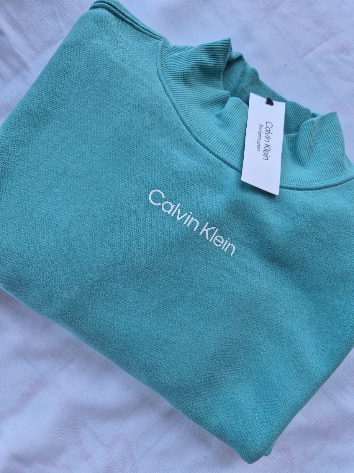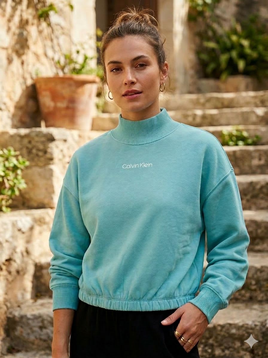 Sudadera de la marca Calvin Klein ORIGINAL color turquesa, con cuello alto y ajuste en la parte inferior. Con etiqueta aún visible. Ideal para un look casual.