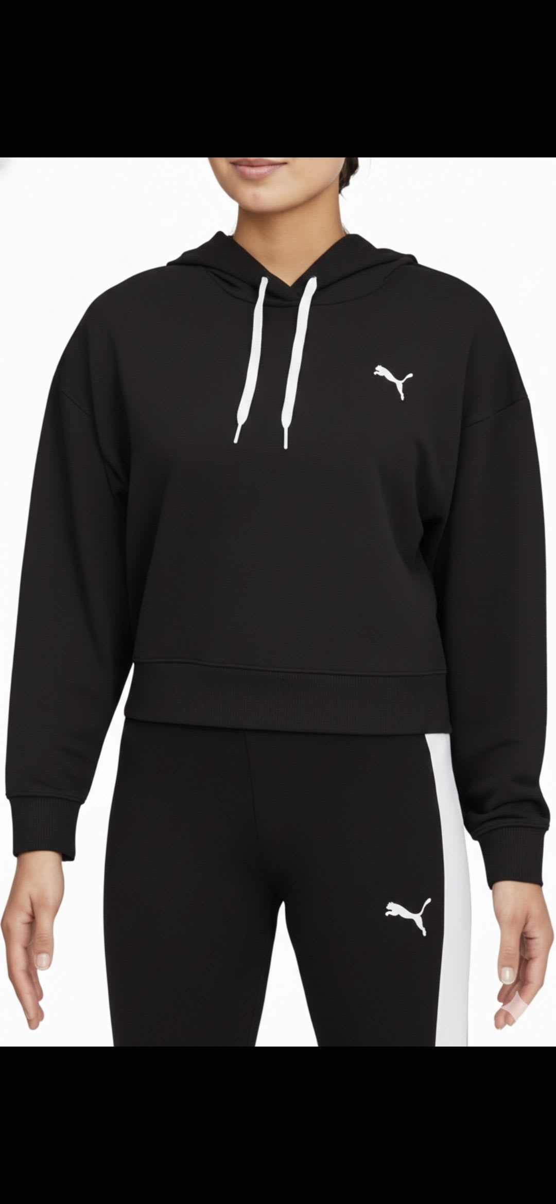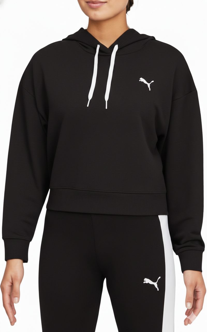 Sudadera de la marca Puma en color negro, ideal para uso diario o actividades deportivas. Presenta un diseño moderno con capucha y logo en el pecho. Perfecta para combinar con leggings o jeans.