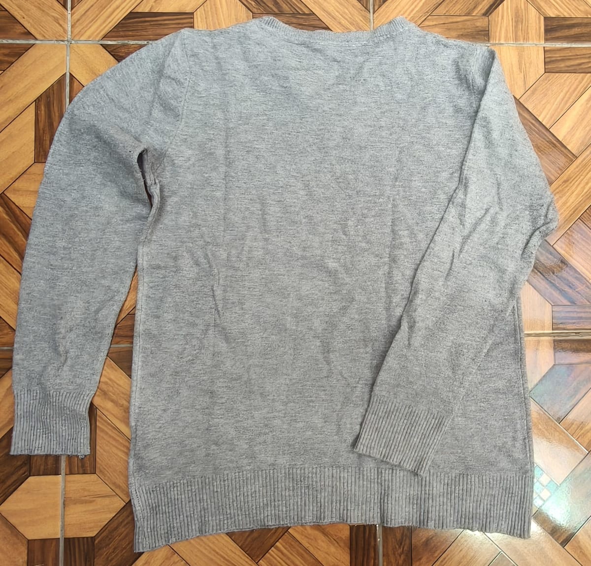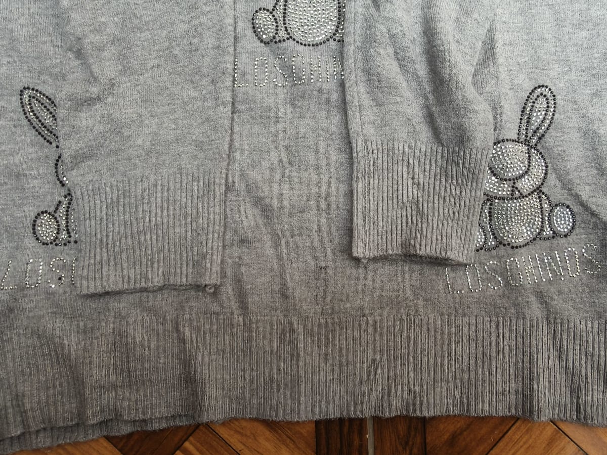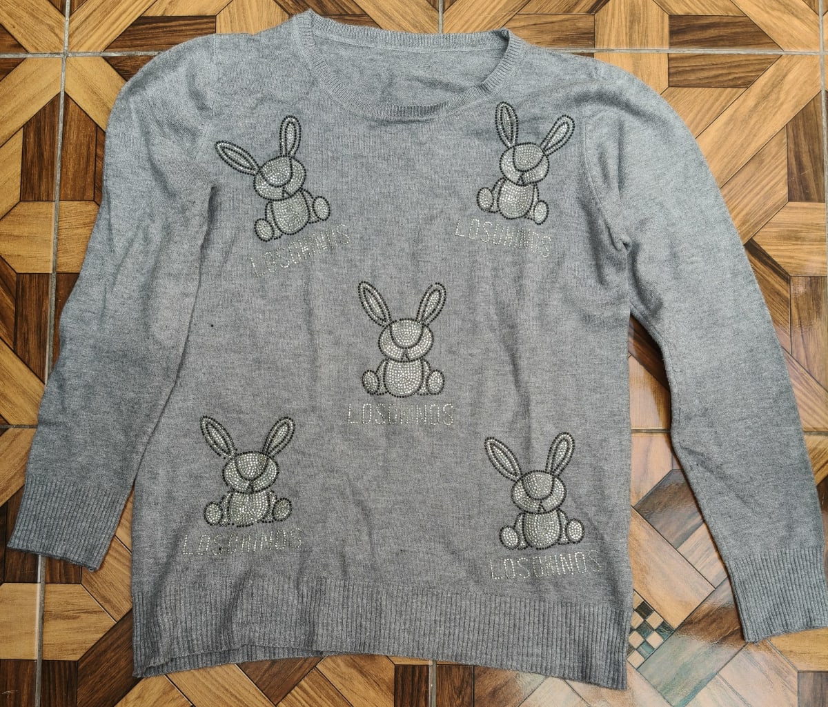 Suéter de color gris con un diseño divertido de conejitos en la parte frontal. Está en buen estado, con algunos signos de uso visibles, pero sin daños importantes. Ideal para uso casual y cómodo. Perfecta para combinar con jeans o leggings.