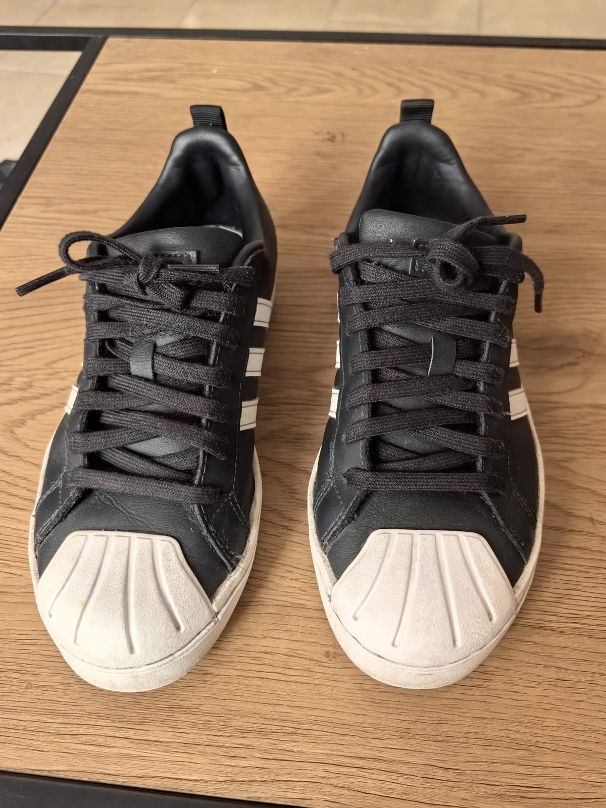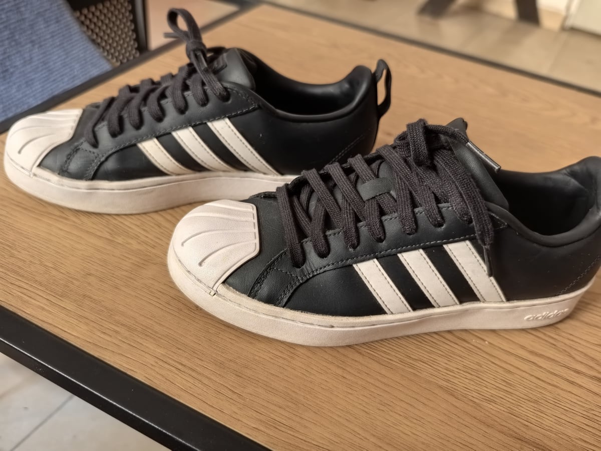 Tenis Adidas modelo Superstar en color negro con detalles en blanco. Presentan un ligero desgaste en la punta y la suela, pero en general están en buen estado. Talla 7.5 (US) y fabricados en Indonesia. Ideal para uso diario o casual.