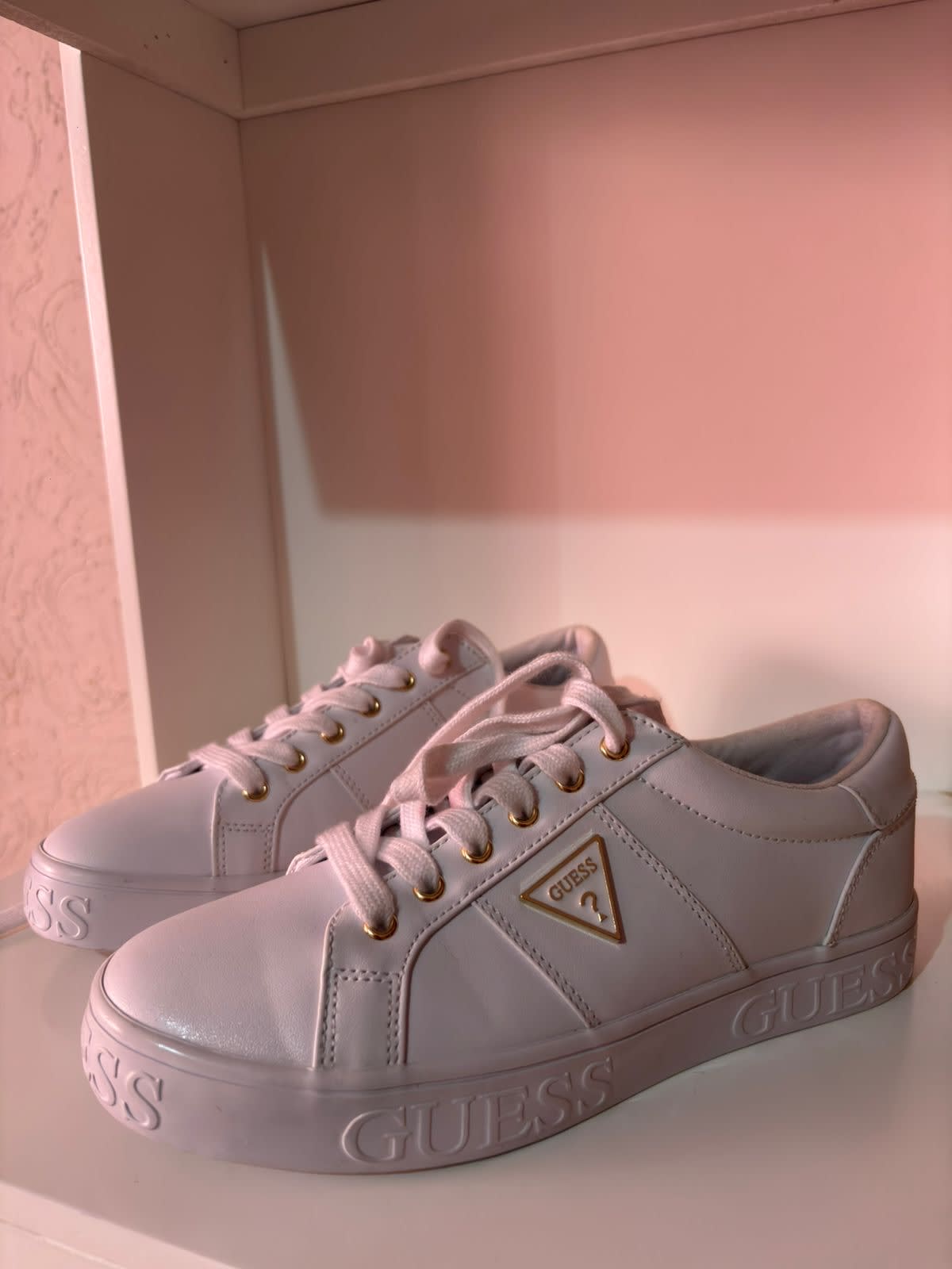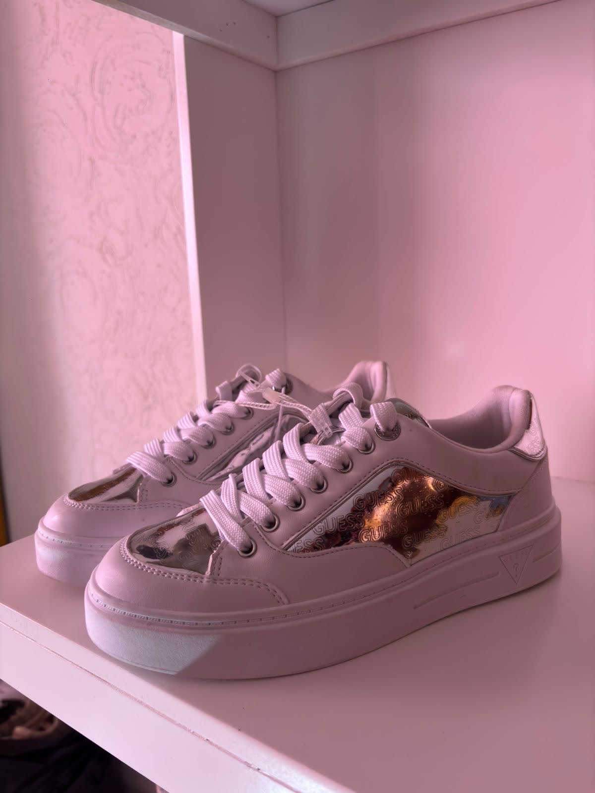Tenis de la marca Guess en color blanco, con detalles metálicos en los costados. En buen estado, con poco uso y sin daños visibles. Incluyen cordones originales y son ideales para un look casual. Perfectos para combinar con cualquier outfit.