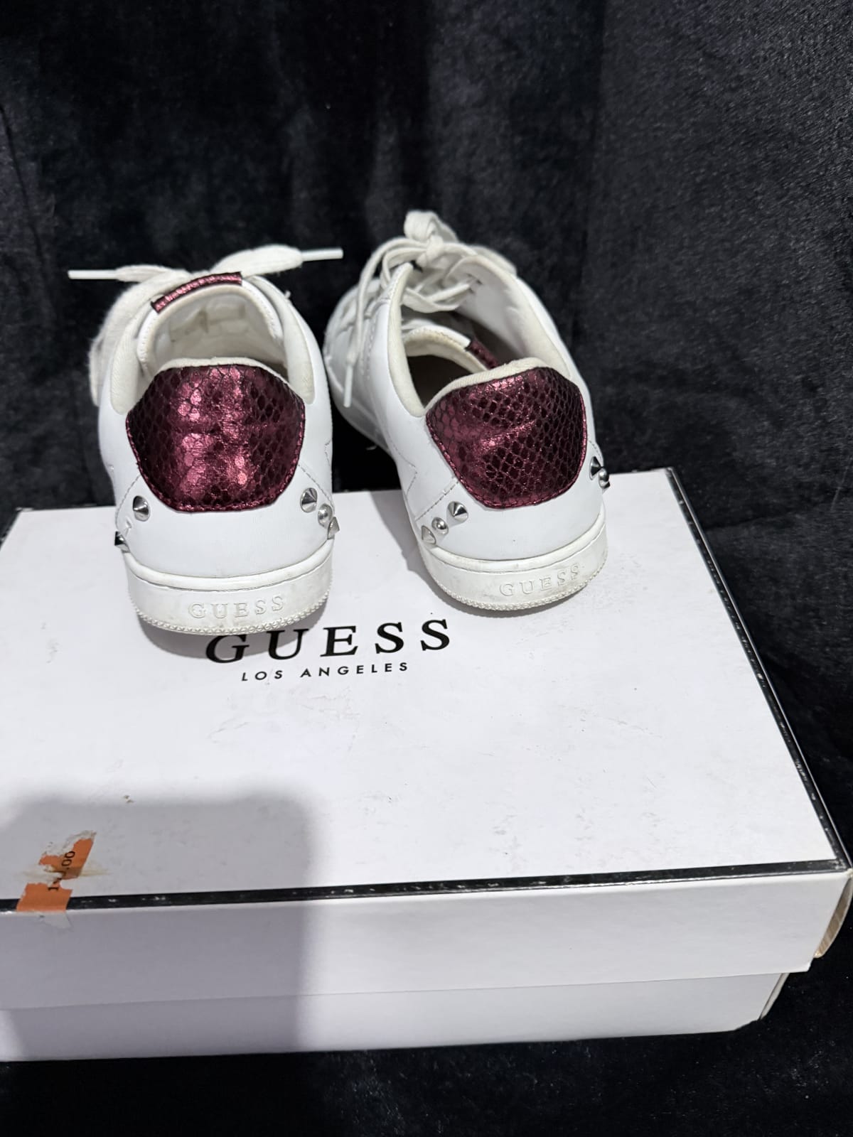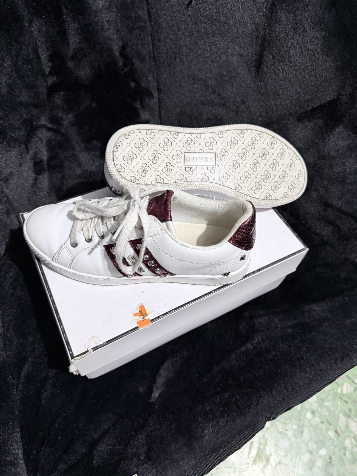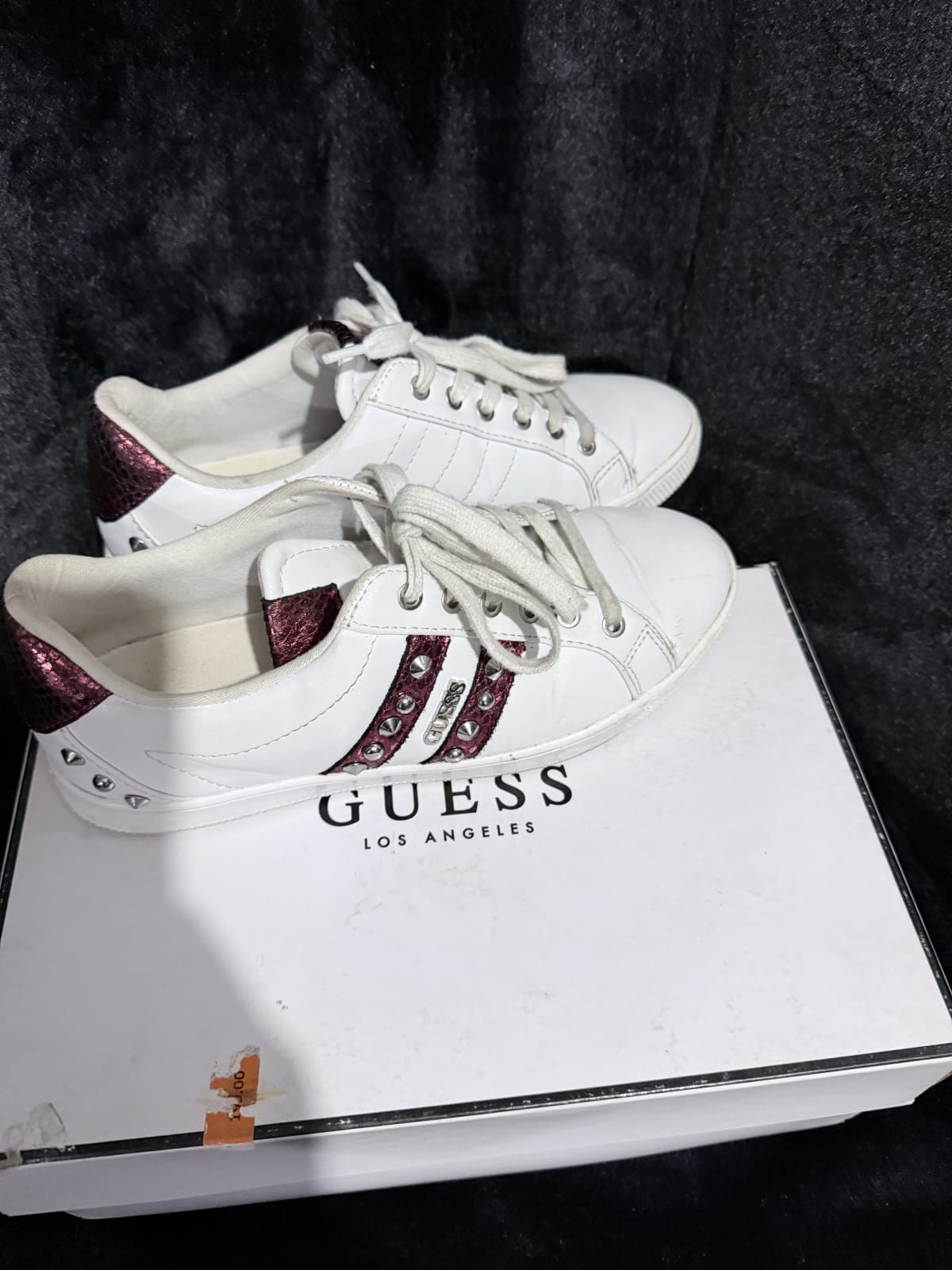 Tenis de la marca Guess en color blanco con detalles en burdeos y aplicaciones metálicas. Están en buen estado, con un uso moderado, y vienen con su caja original. La suela muestra ligeros signos de desgaste, pero no afecta su funcionalidad. Ideal para un look casual y cómodo.