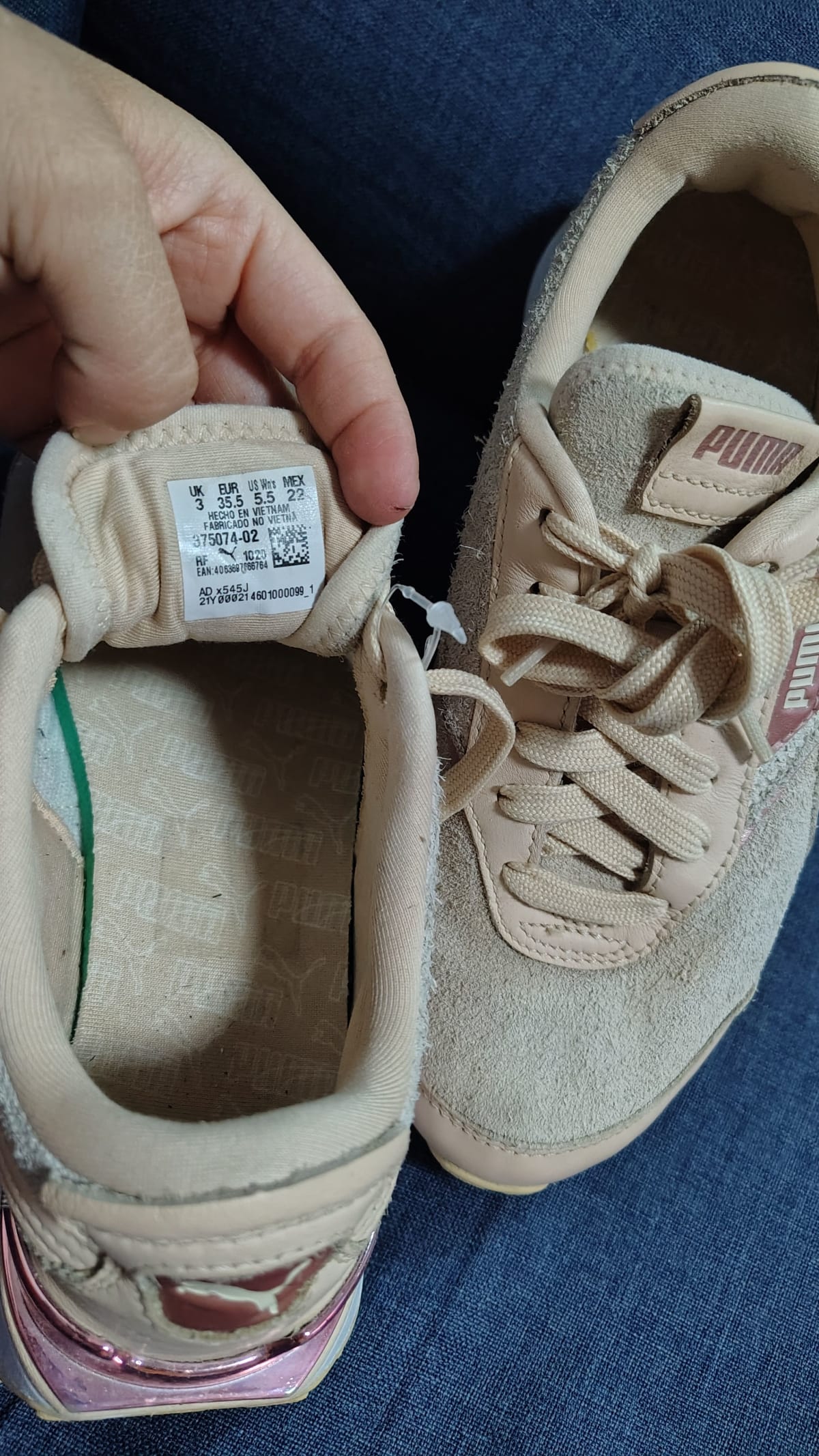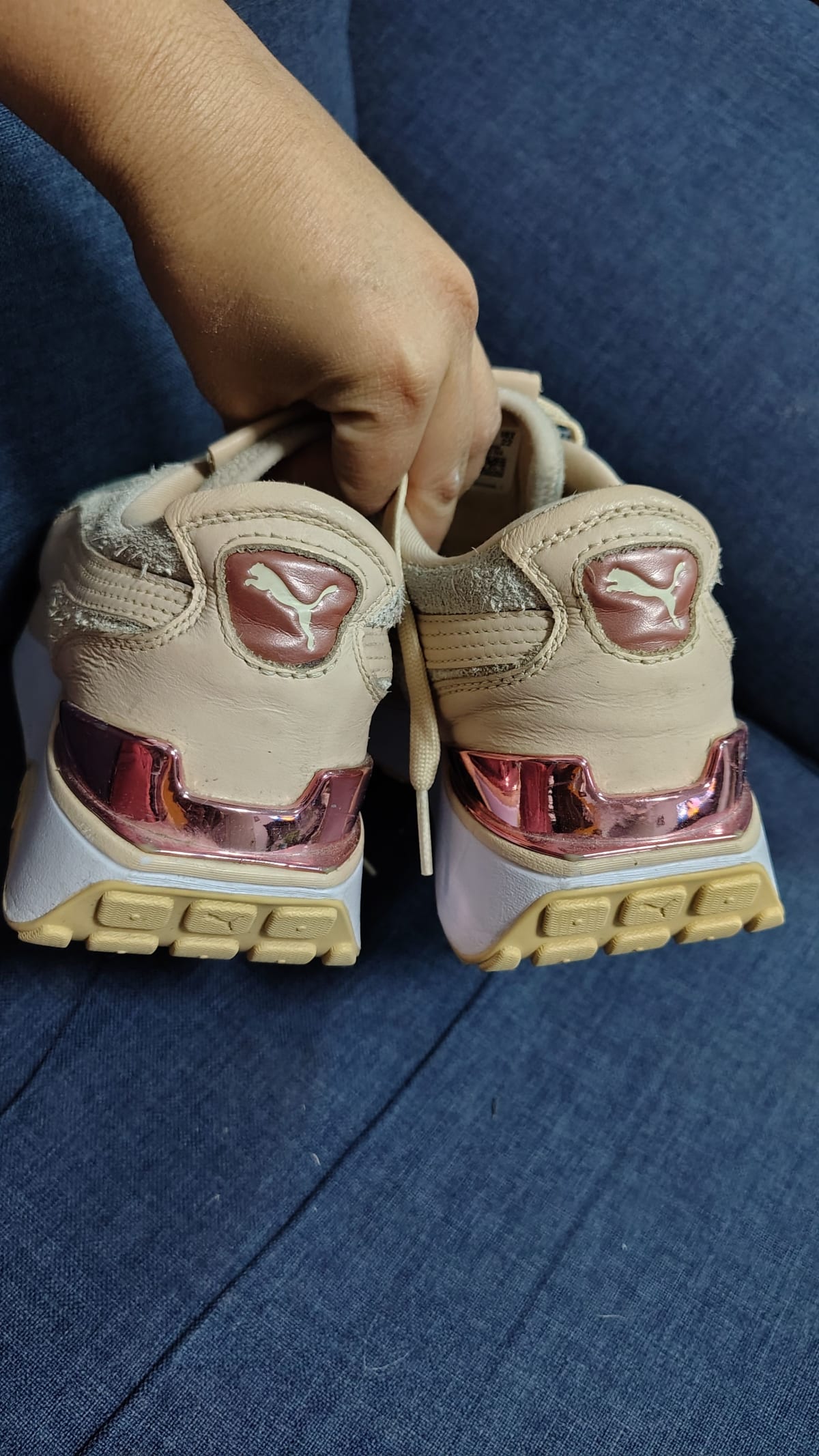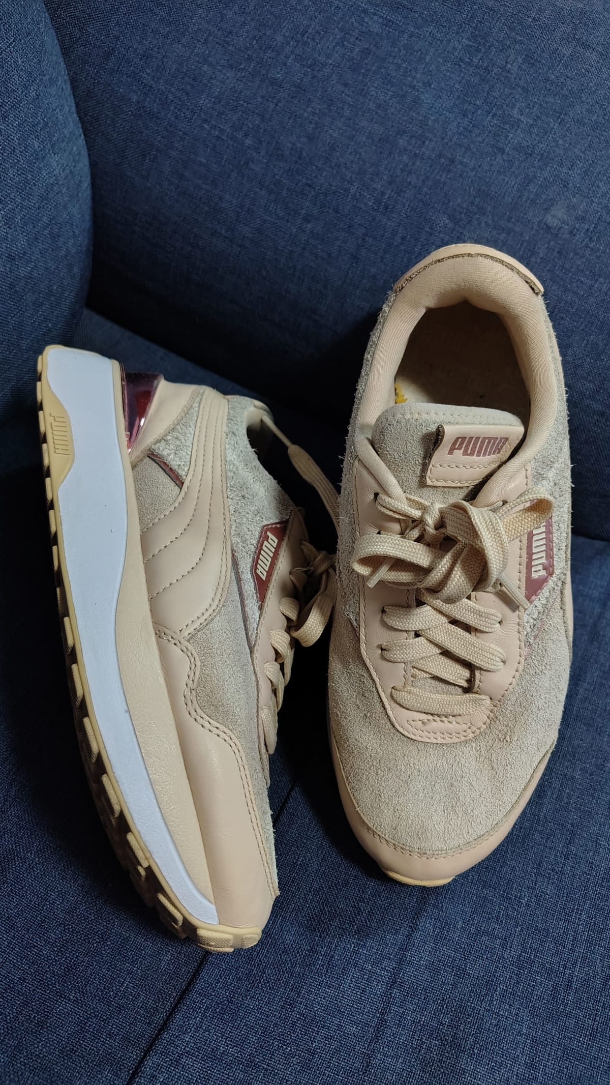 Tenis Puma en color beige, en buen estado con ligeros signos de uso. Cuentan con una parte superior de gamuza y detalles en plástico brillante. La suela muestra un desgaste mínimo, ideal para uso diario. Incluyen etiquetas originales y son de talla 22 (MX).