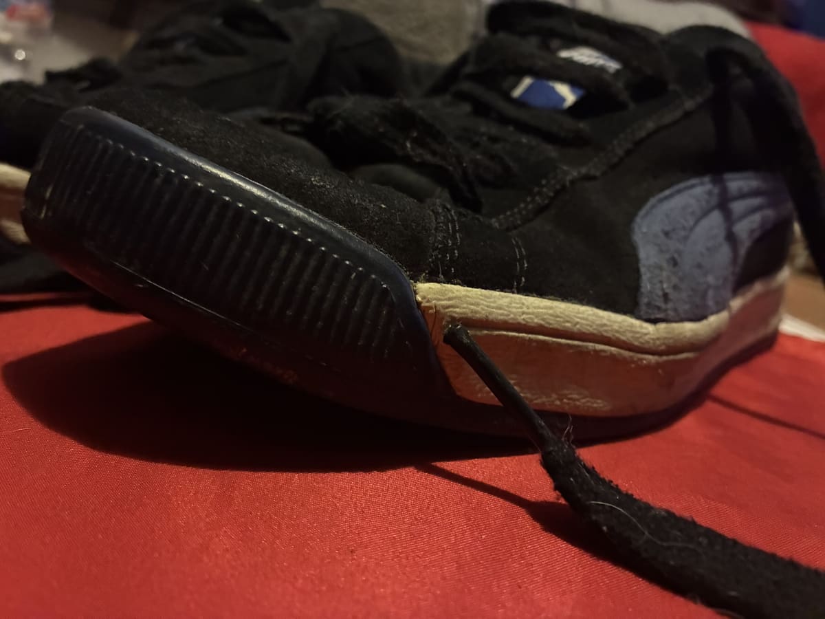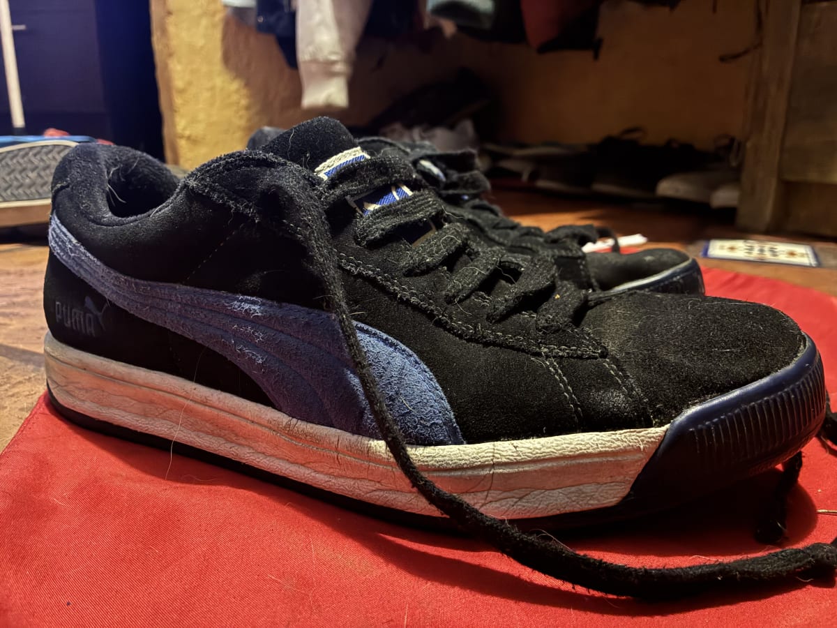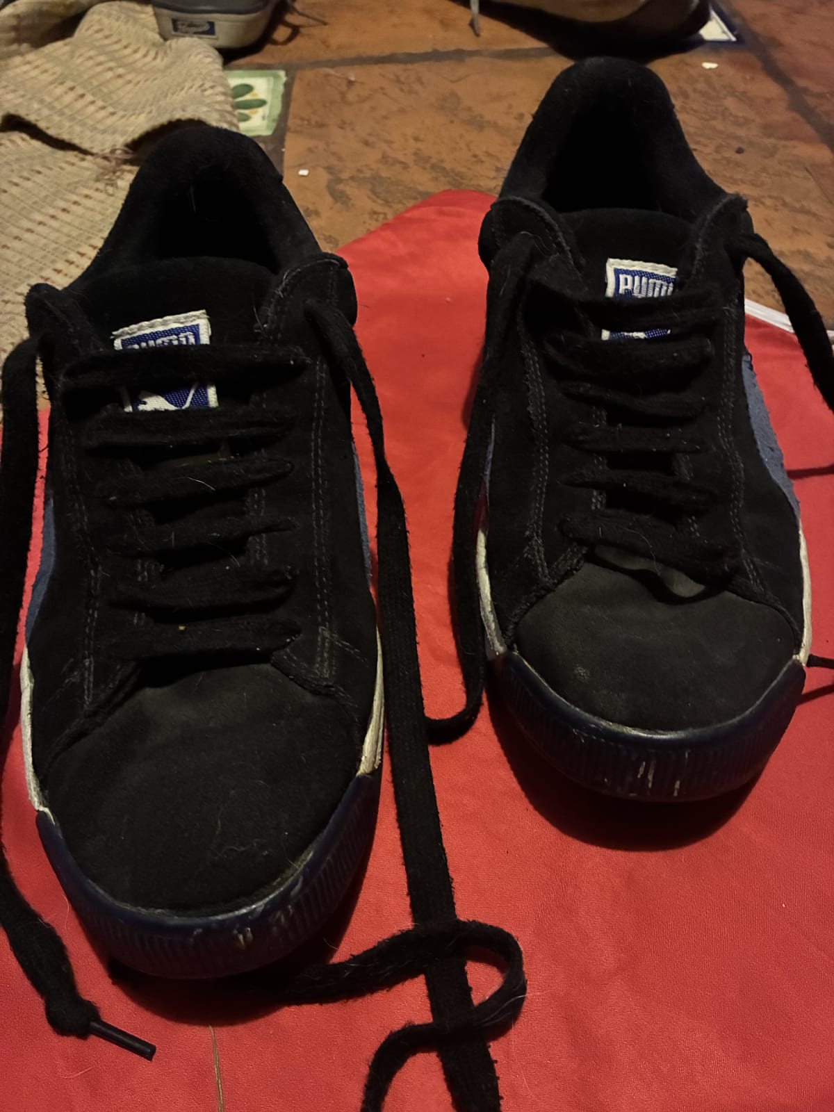 Tenis Puma en color negro con detalles azules. Presentan signos de uso, con desgaste visible en la suela y la parte superior. Cuentan con cordones y están listos para usar. Ideal para quienes buscan comodidad y estilo a un buen precio.