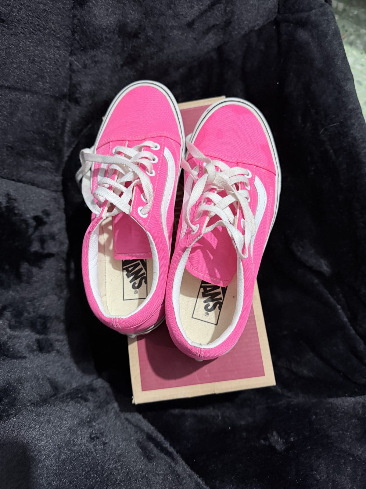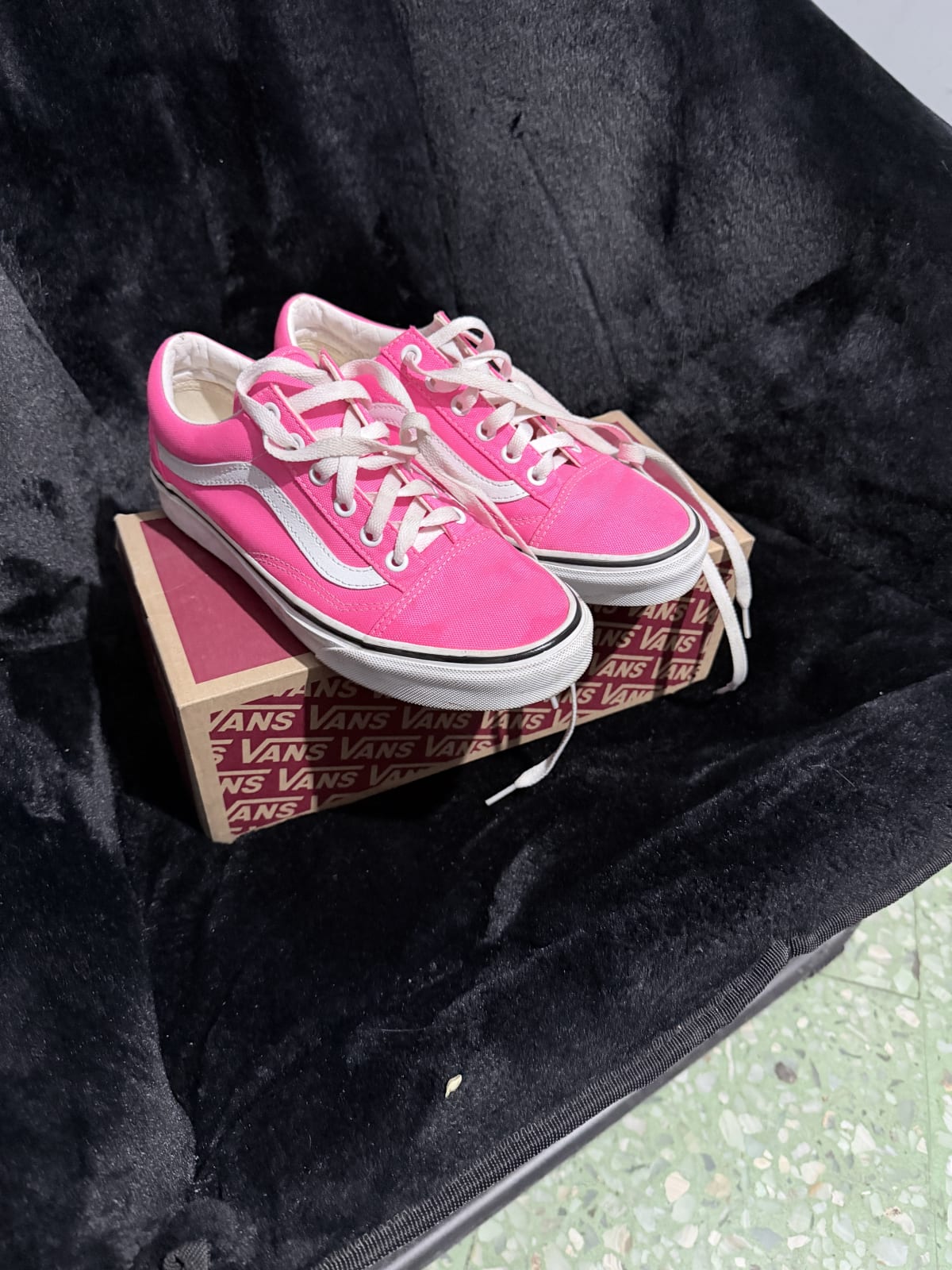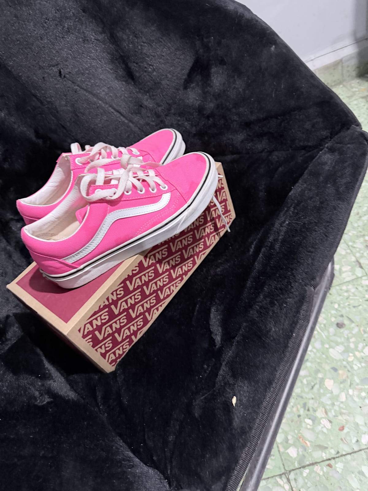 Tenis Vans en color rosa, talla 24,5 Están en buen estado, con ligeras marcas de uso visibles en la parte superior. Incluyen la caja original. Ideal para un look casual y cómodo.