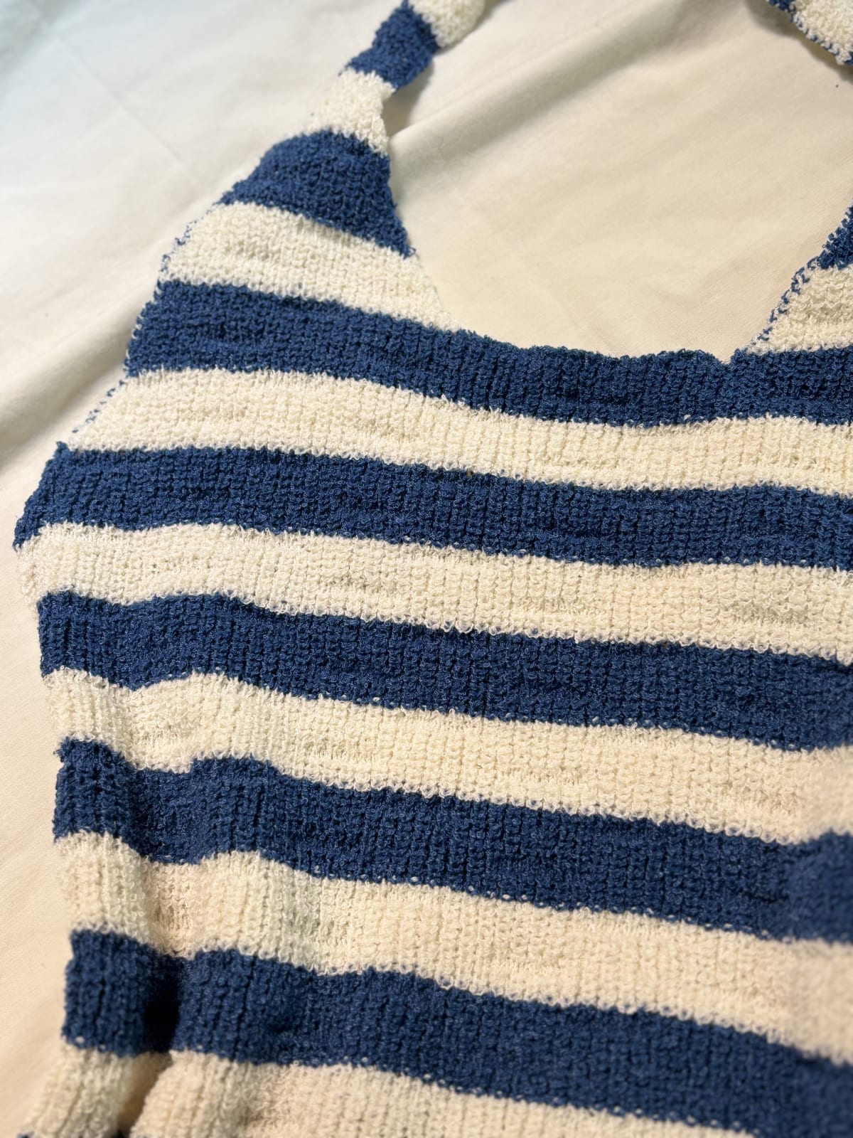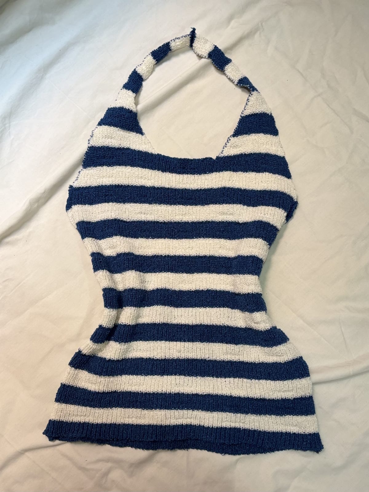 Top de tirantes con diseño de rayas en azul y blanco. Está en buen estado, sin manchas visibles ni daños. Ideal para el verano, combina fácilmente con diferentes outfits. Perfecto para usar en días calurosos o en la playa.