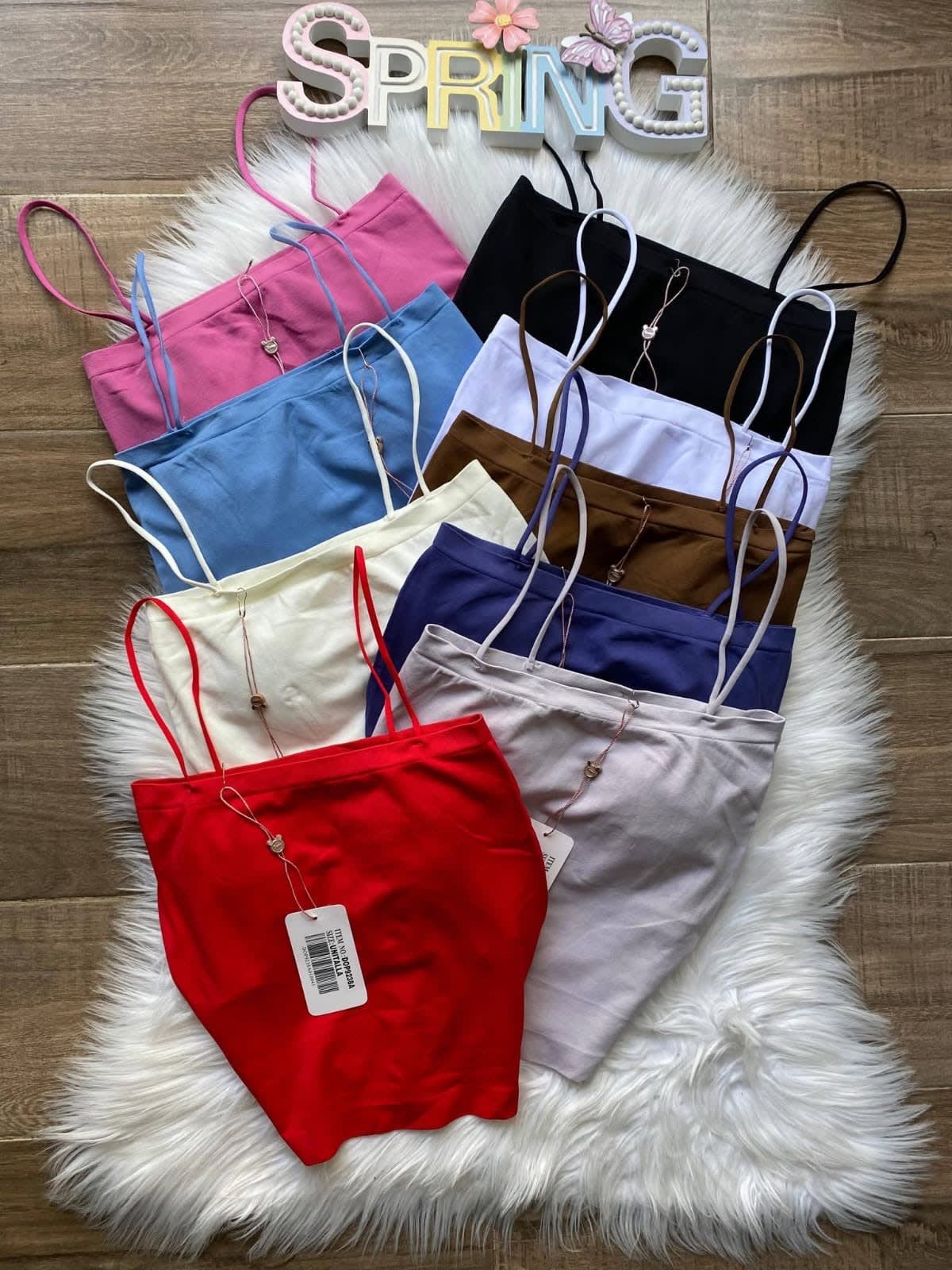 varios tops sin mangas en diferentes colores: rojo, blanco, azul, negro, y más. Todos están en buen estado, con etiquetas visibles. Son ideales para combinar con jeans o faldas. Perfectos para la temporada de primavera y verano.