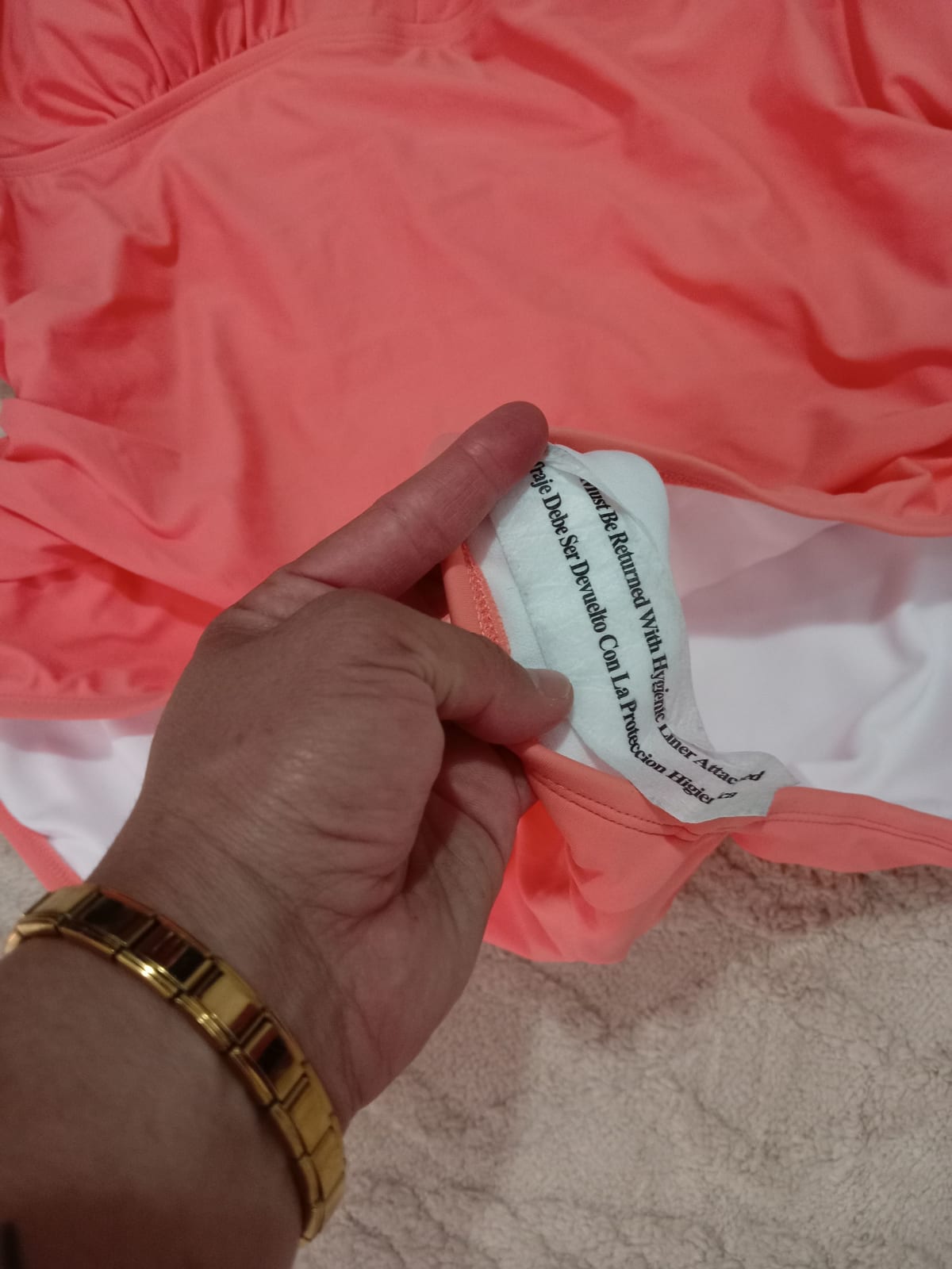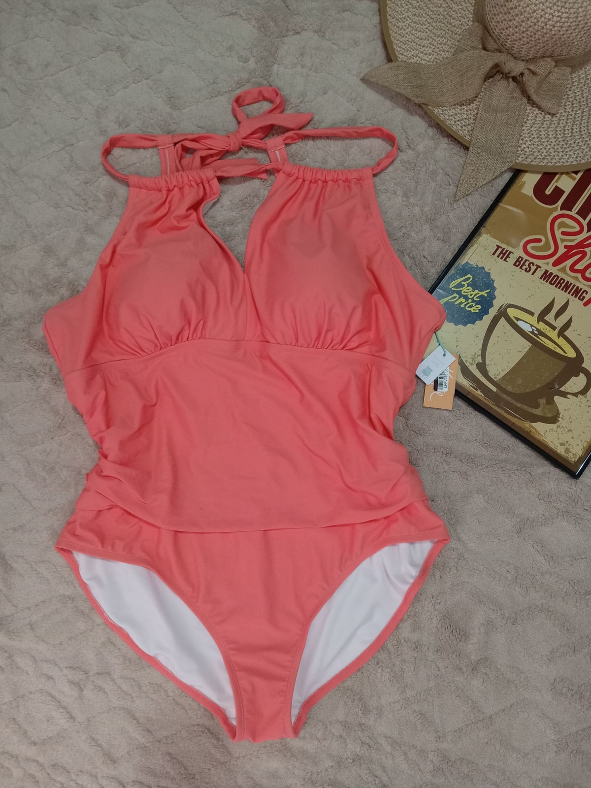 Este traje de baño de una pieza en color coral es ideal para disfrutar del sol y la playa. Tiene un diseño con tirantes ajustables y un acabado cómodo. Se encuentra en buen estado, con etiqueta visible.