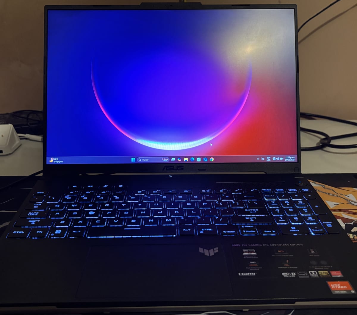 Laptop ASUS TUF Gaming en buen estado. Pantalla funcional y teclado retroiluminado. Presenta ligeras marcas de uso en la carcasa, pero sin daños visibles en la pantalla. Ideal para gamers y tareas de alto rendimiento. No incluye caja original ni accesorios adicionales.