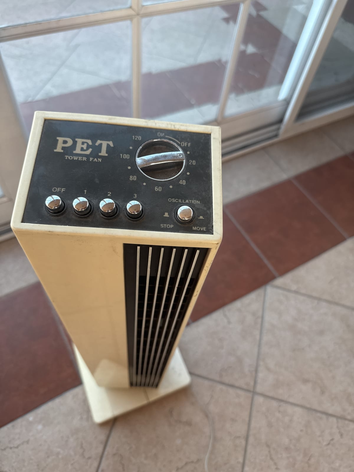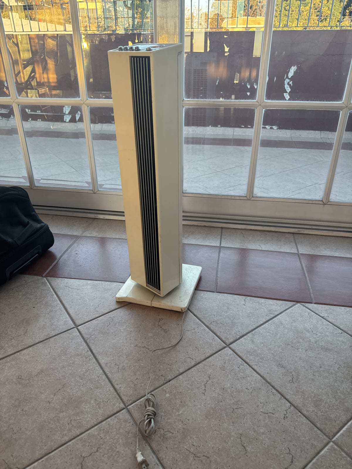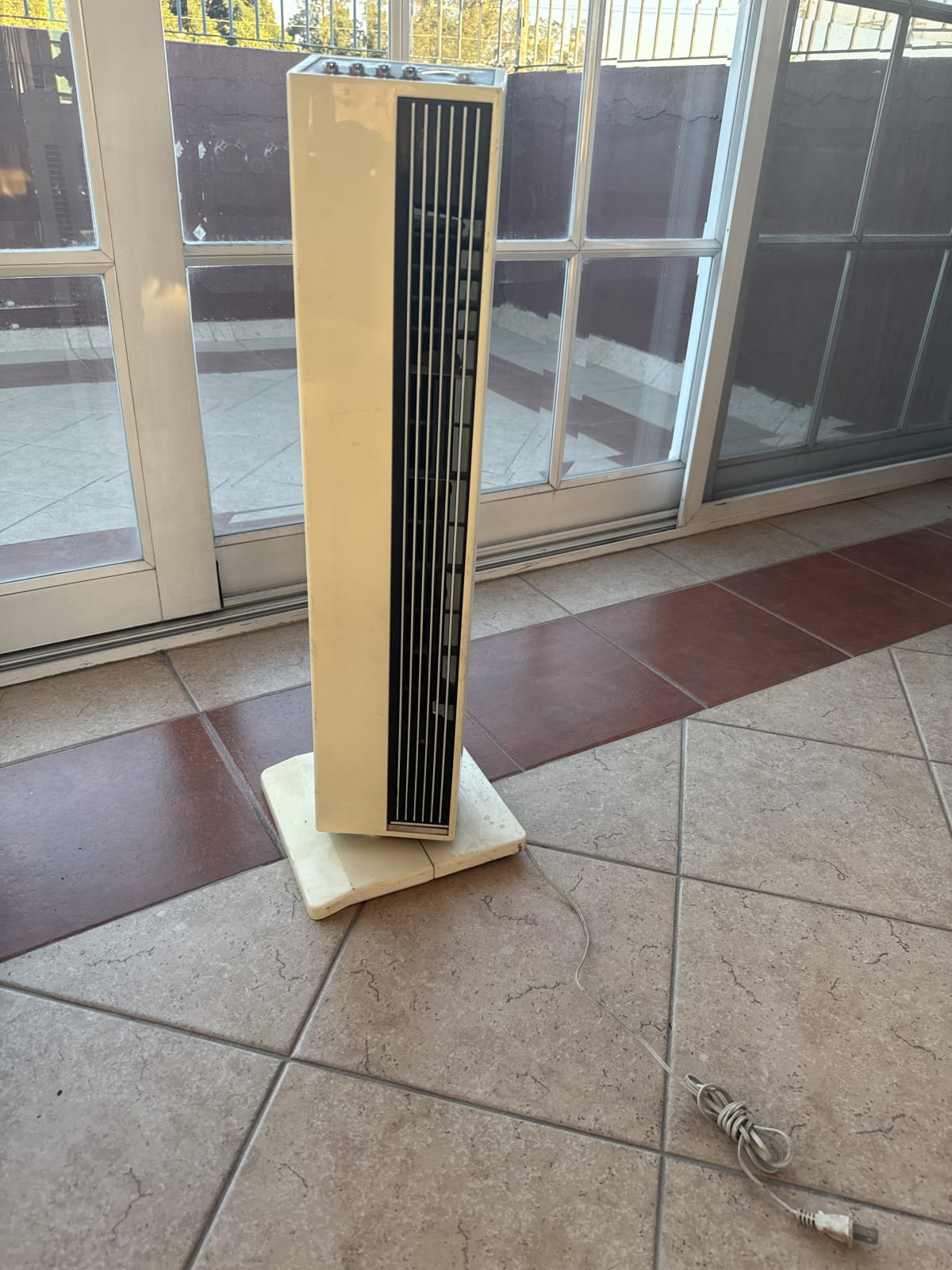 Este ventilador de torre marca PET está en buen estado y funciona correctamente. Tiene varias velocidades y opción de oscilación. Presenta algunas marcas de uso en la base y en la parte superior, pero no afecta su funcionamiento. Ideal para mantener fresco cualquier espacio.