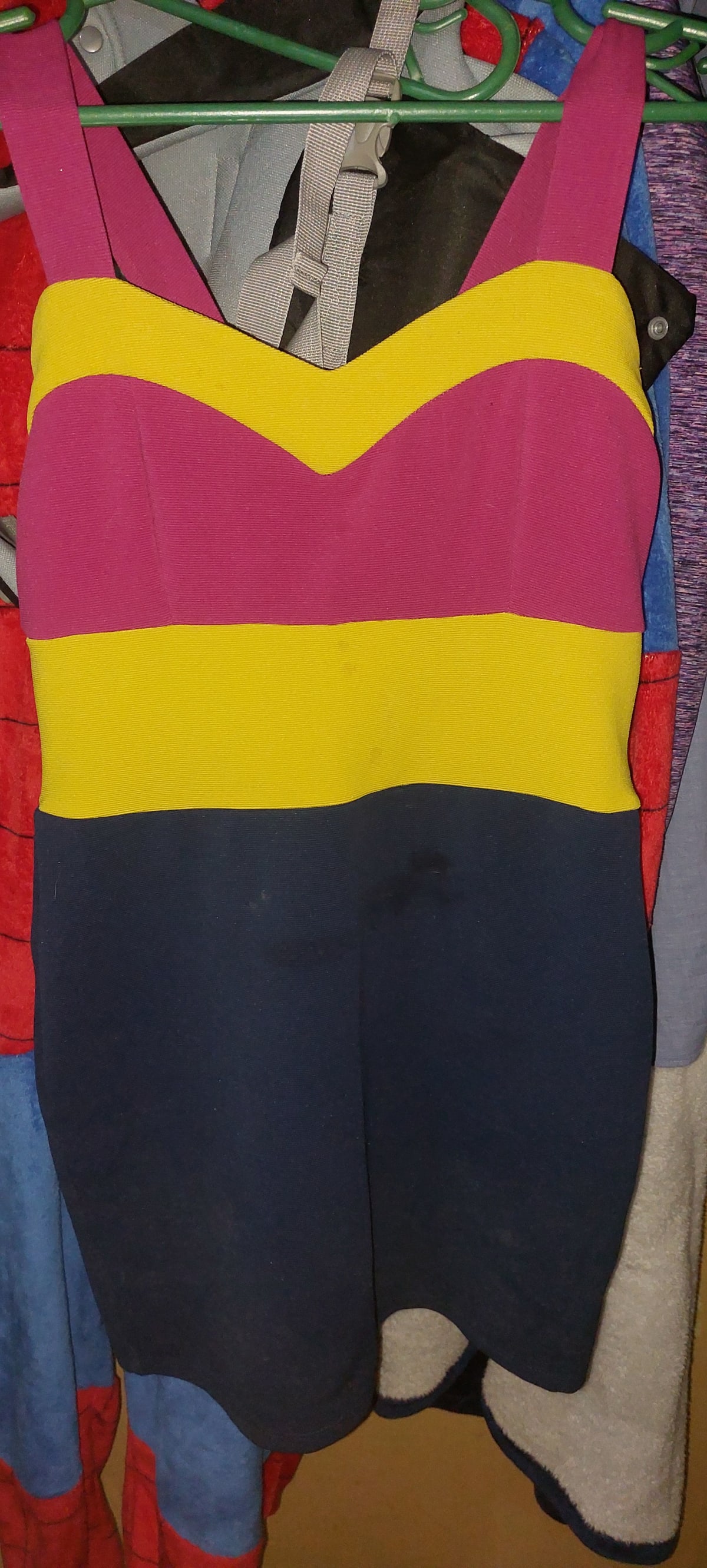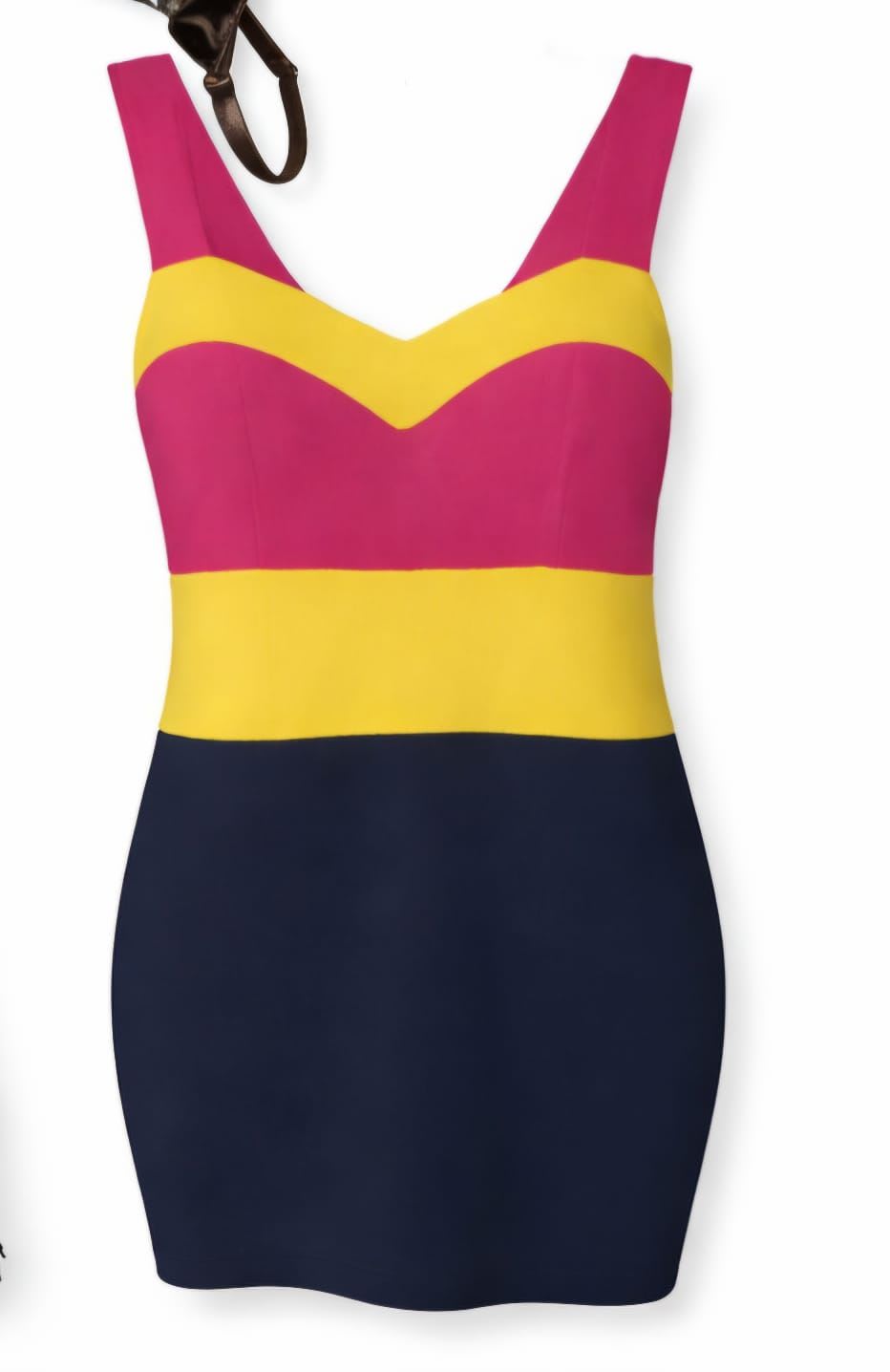 Vestido de baño nuevo, con un diseño vibrante en colores rosa, amarillo y azul marino. Ideal para el verano y días de playa. Tiene tirantes anchos y un corte ajustado que resalta la figura. Sin defectos visibles, pero se recomienda revisar por posibles marcas de uso en la parte inferior.