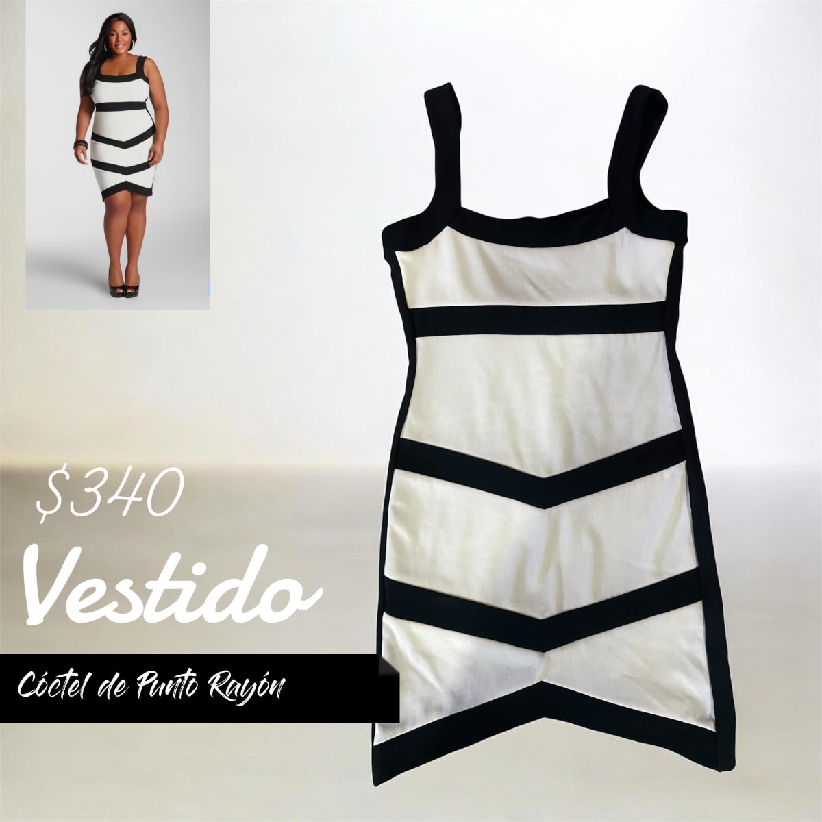 Vestido de coctel en color blanco y negro, con diseño de rayas. Nuevos con etiqueta sin defectos visibles. Ideal para ocasiones especiales, cuenta con tirantes y un corte ajustado que resalta la figura. Perfecto para combinar con tacones y accesorios elegantes.