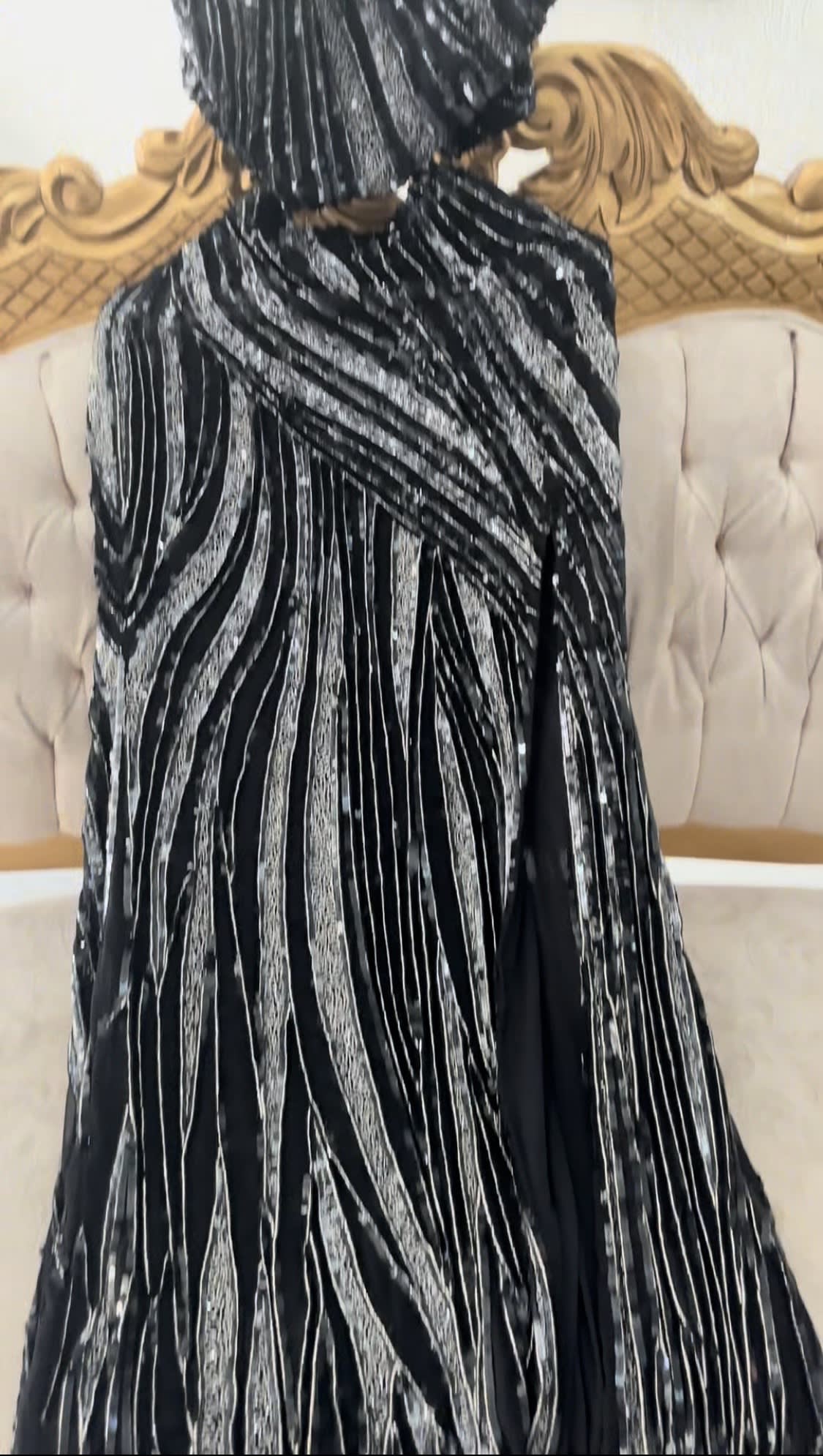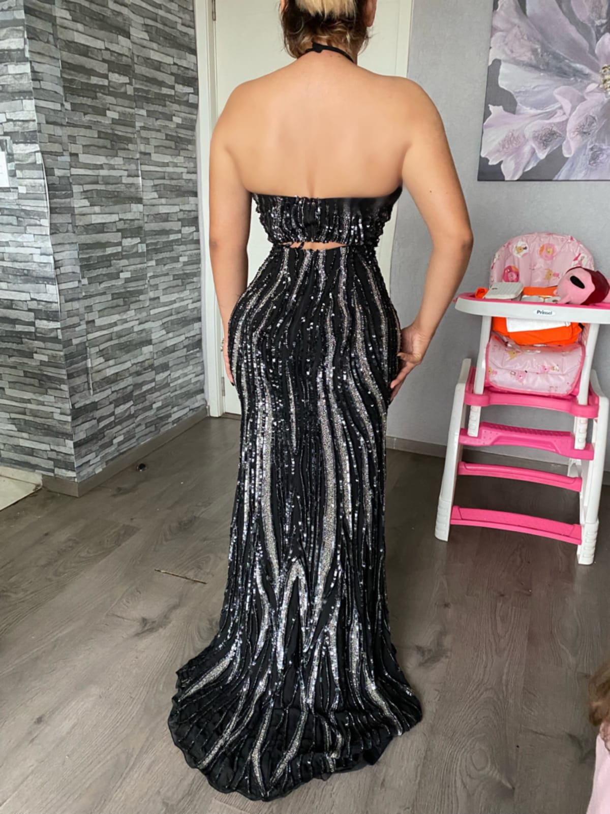 Hermoso vestido largo de noche en color negro con detalles brillantes. Se encuentra en buen estado, sin defectos visibles. Ideal para eventos formales o fiestas. Tiene un diseño ajustado que resalta la figura y un escote strapless.