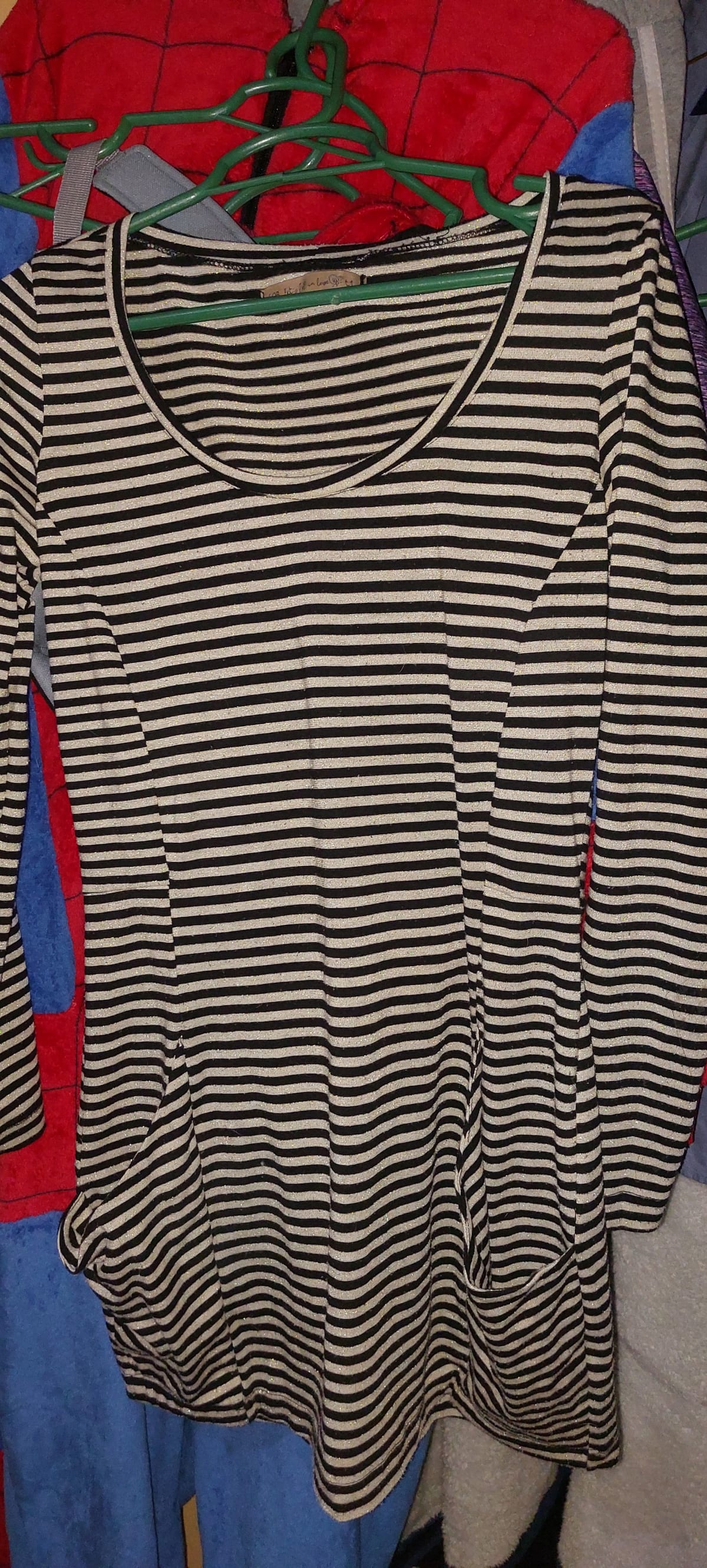 Vestido de manga larga con diseño de rayas en dorado y negro. Tiene dos bolsillos laterales y un corte cómodo. En buen estado, sin defectos visibles. Ideal para uso diario o casual.