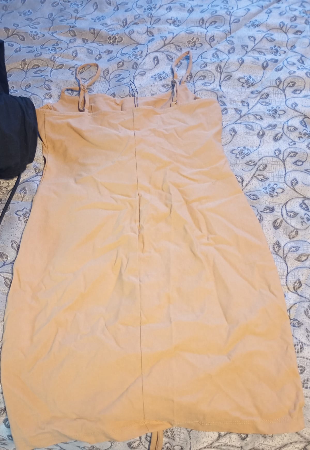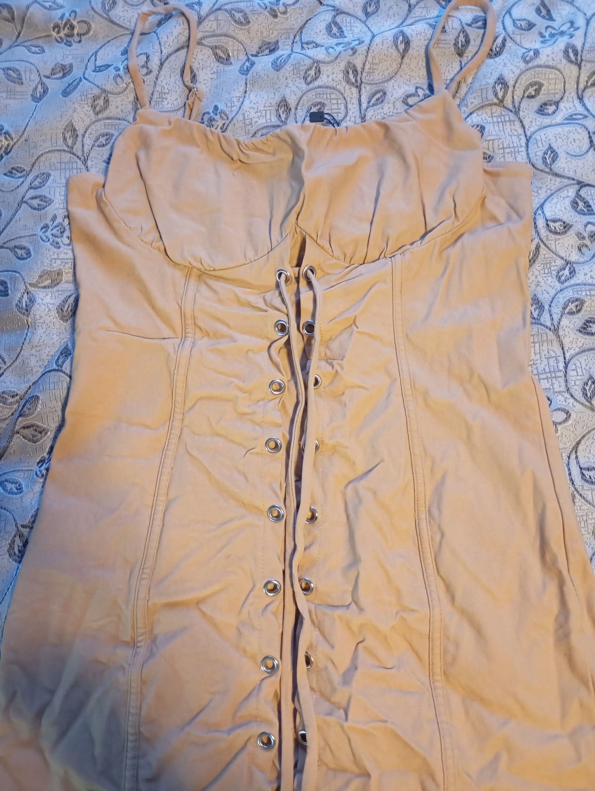 Vestido ligero color beige, ideal para el verano. Tiene tirantes ajustables y un diseño con botones en la parte frontal. En buen estado, aunque presenta algunas arrugas visibles. Perfecto para ocasiones casuales o salidas al aire libre.