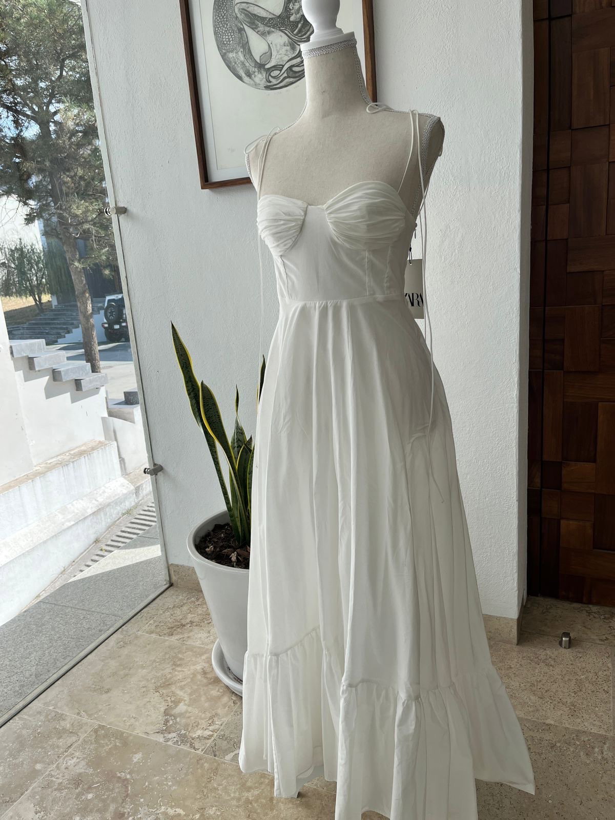 Vestido blanco de verano marca Zara . Tela de popelina con cierre a un costado .