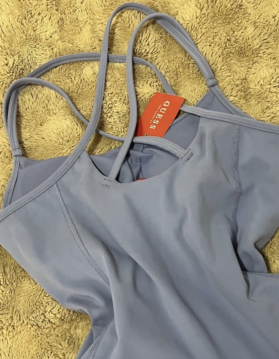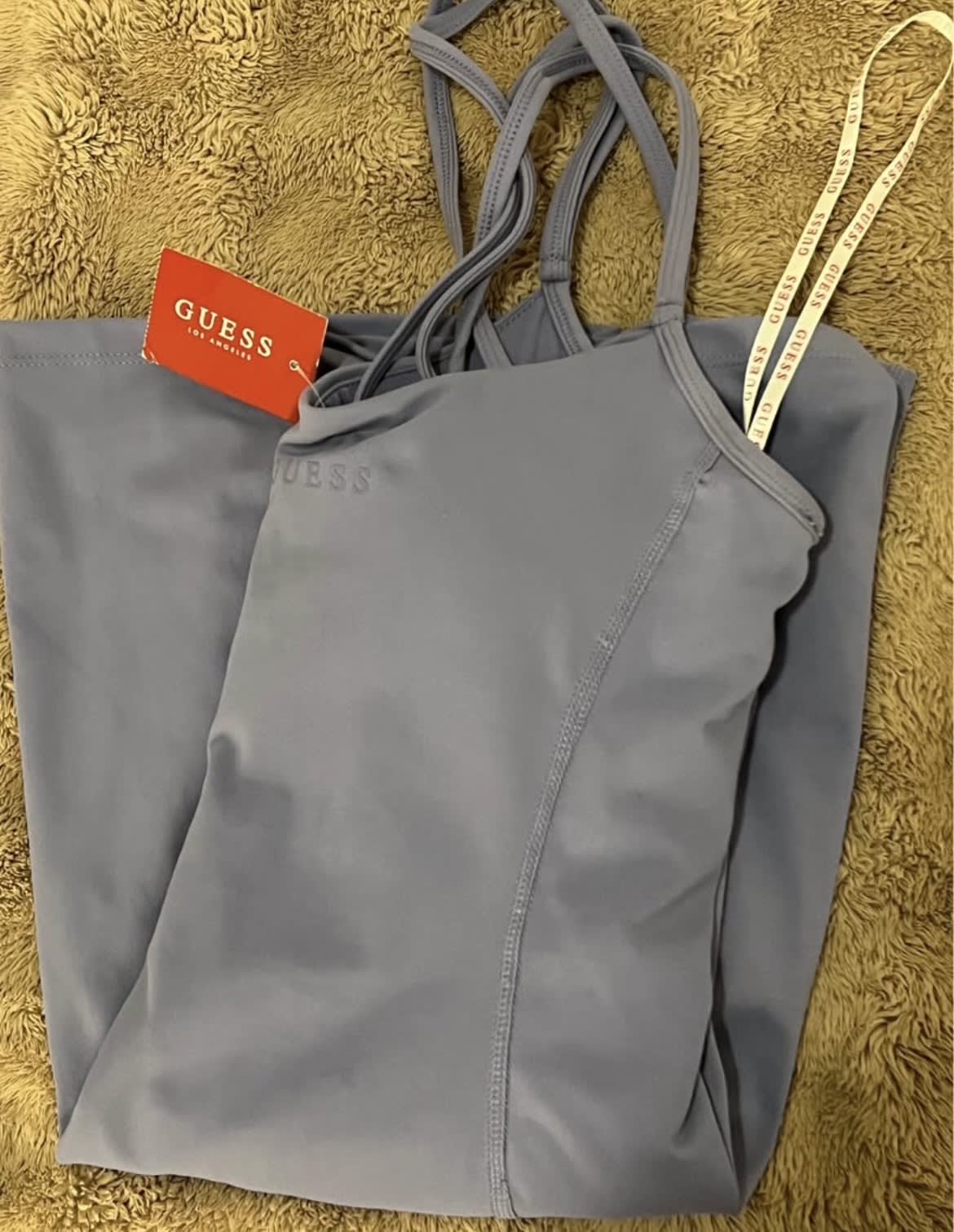 Top deportivo de la marca Guess en color morado. El producto es nuevo y cuenta con etiquetas originales. Ideal para actividades deportivas o uso casual. Su diseño con tirantes cruzados ofrece comodidad y estilo.