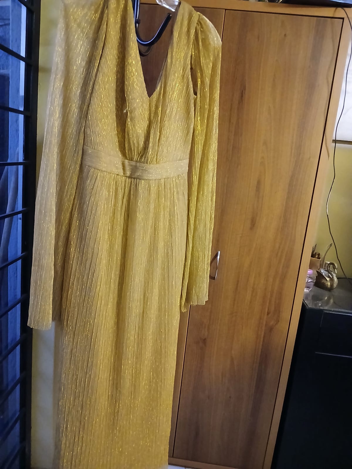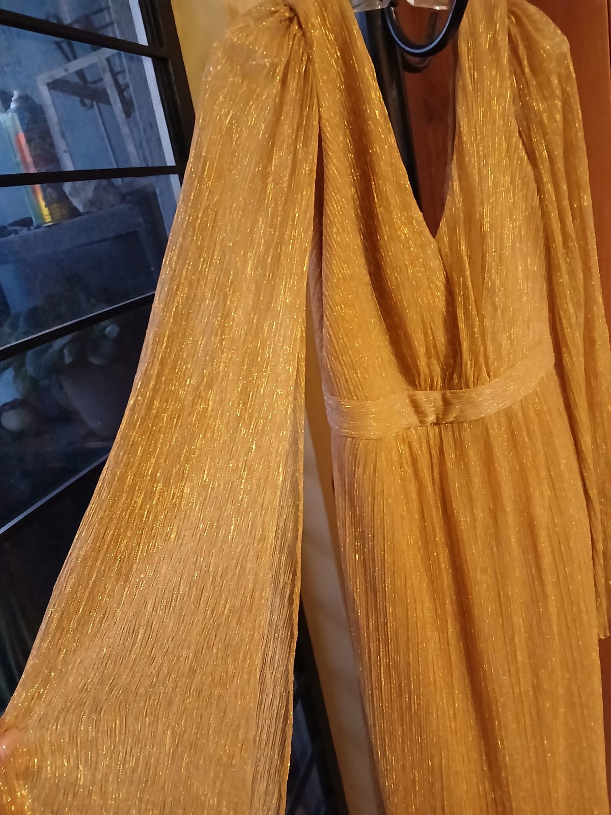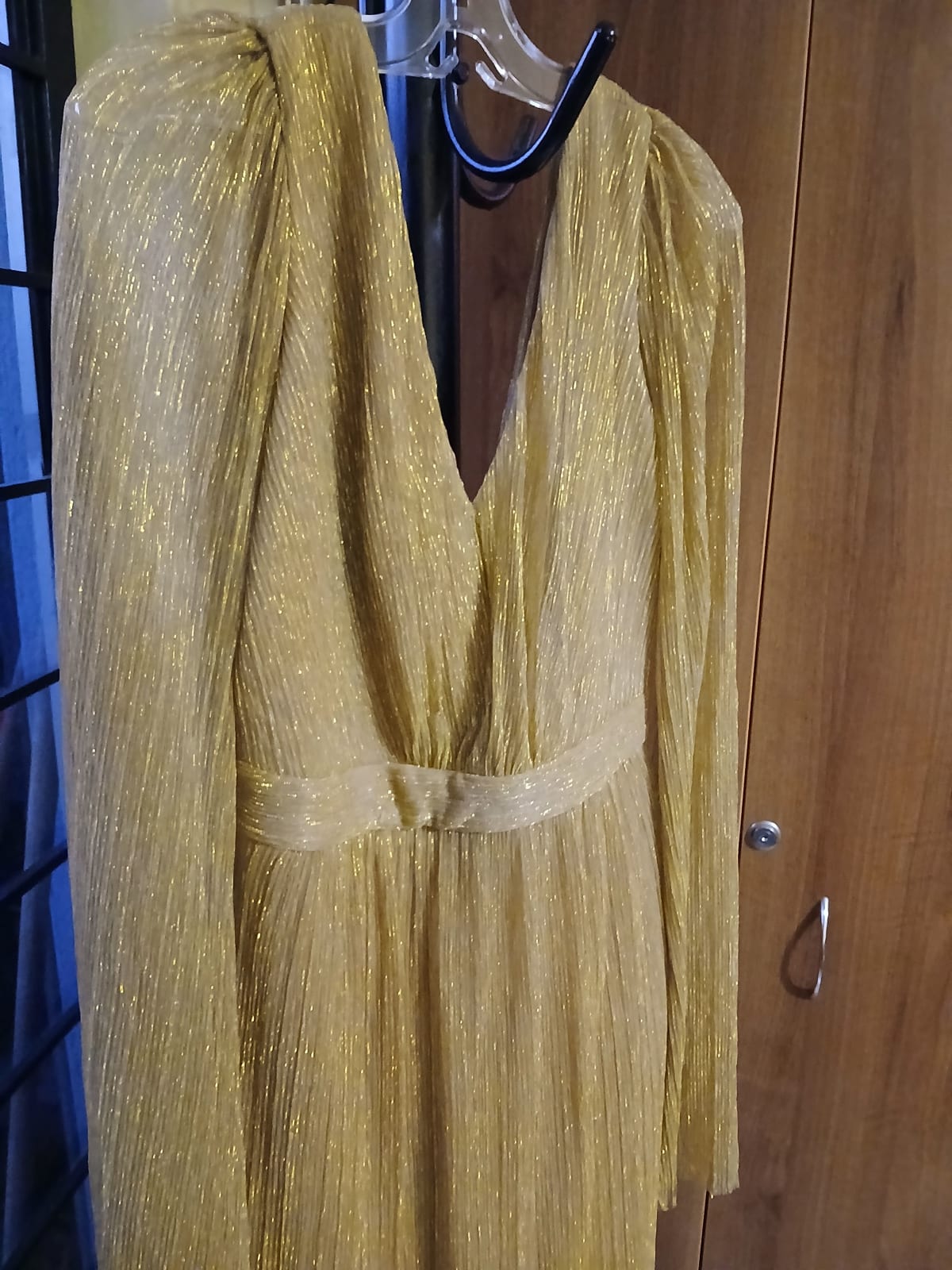 Este hermoso vestido largo de color dorado tiene un diseño elegante con mangas largas y un escote en V. La tela tiene un acabado brillante que le da un toque especial, perfecto para ocasiones formales. Está en buen estado, tiene solo una puesta, sin manchas ni daños, ideal para lucir en eventos. Talla 8.
