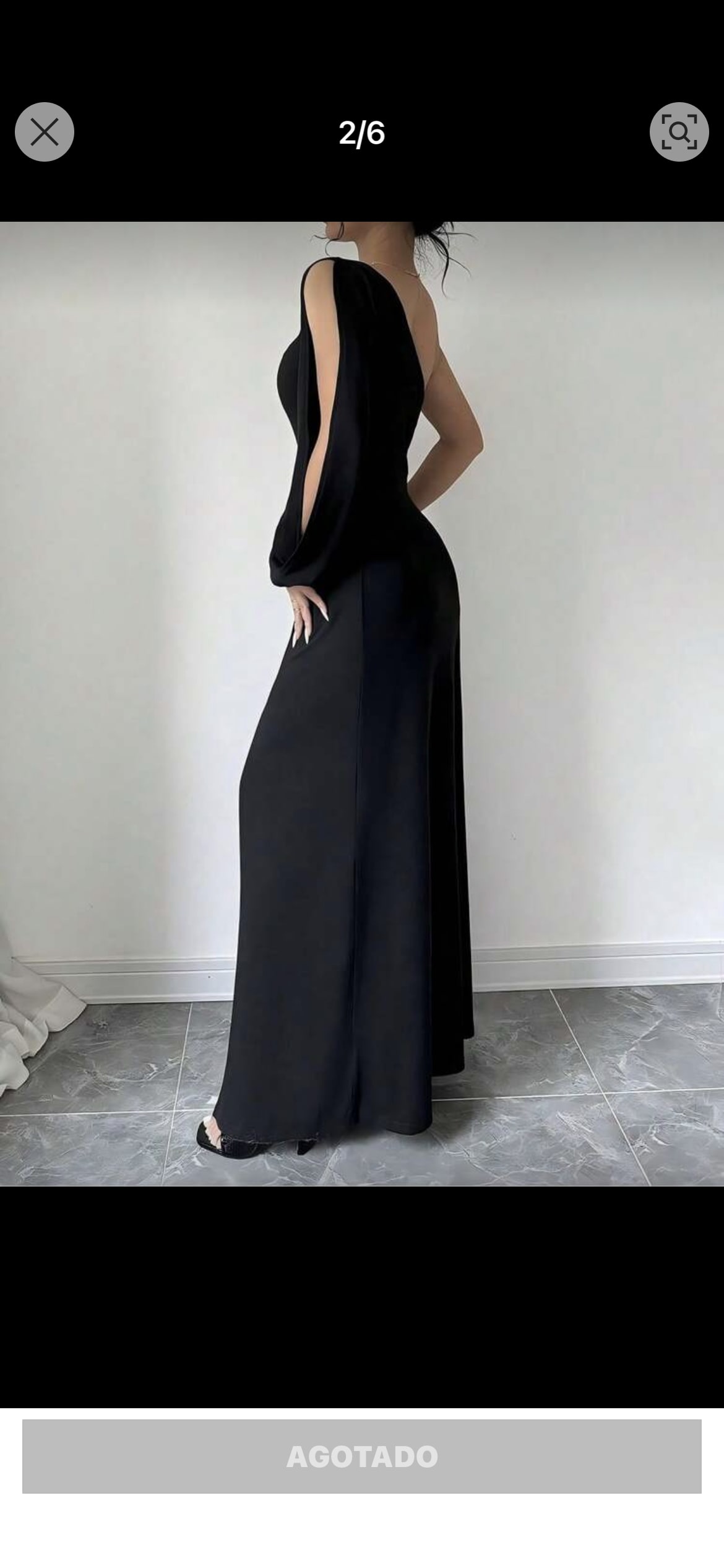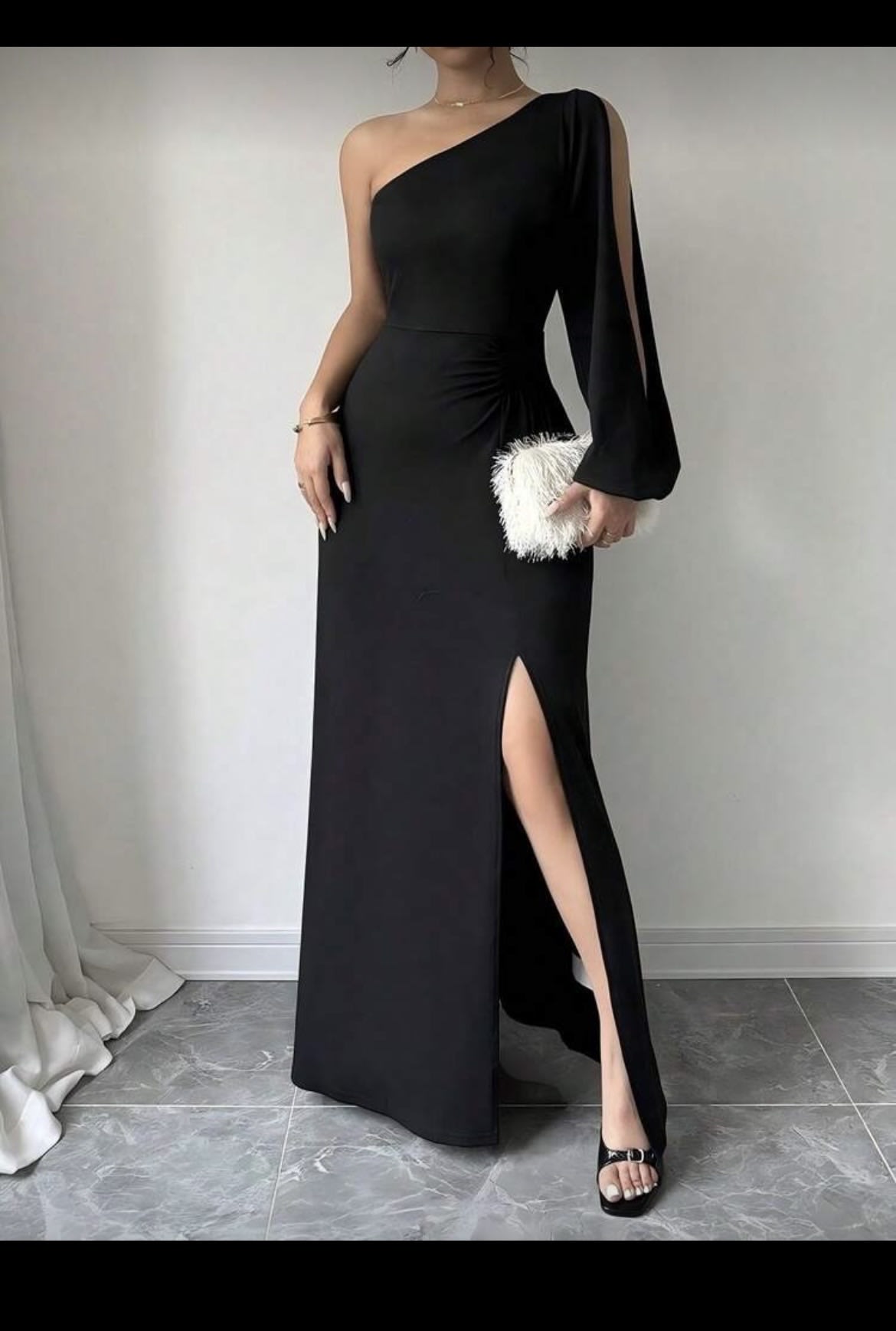 Este elegante vestido largo negro presenta un diseño de una sola manga y una abertura lateral que realza la figura. Está en buen estado, sin defectos visibles, y es ideal para ocasiones especiales. Incluye un detalle de fruncido en la parte delantera y es de material ligero y cómodo.