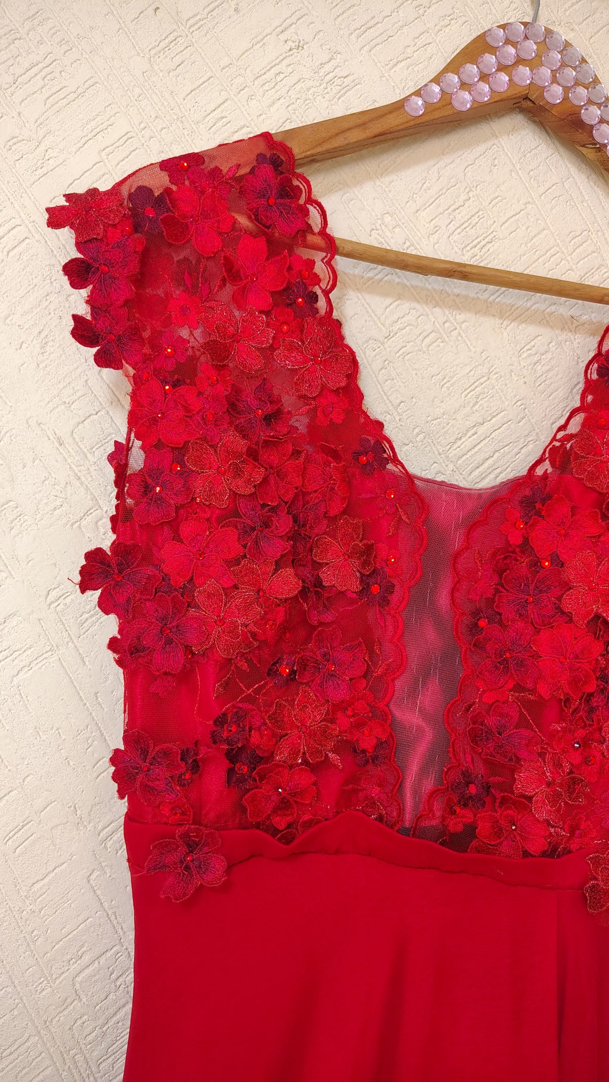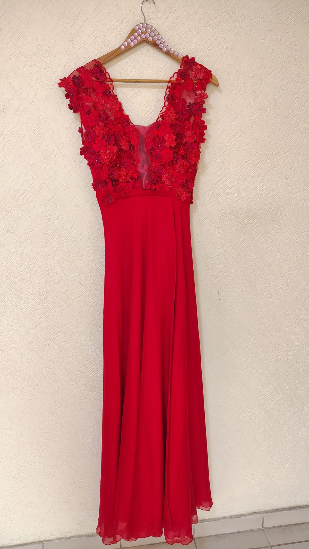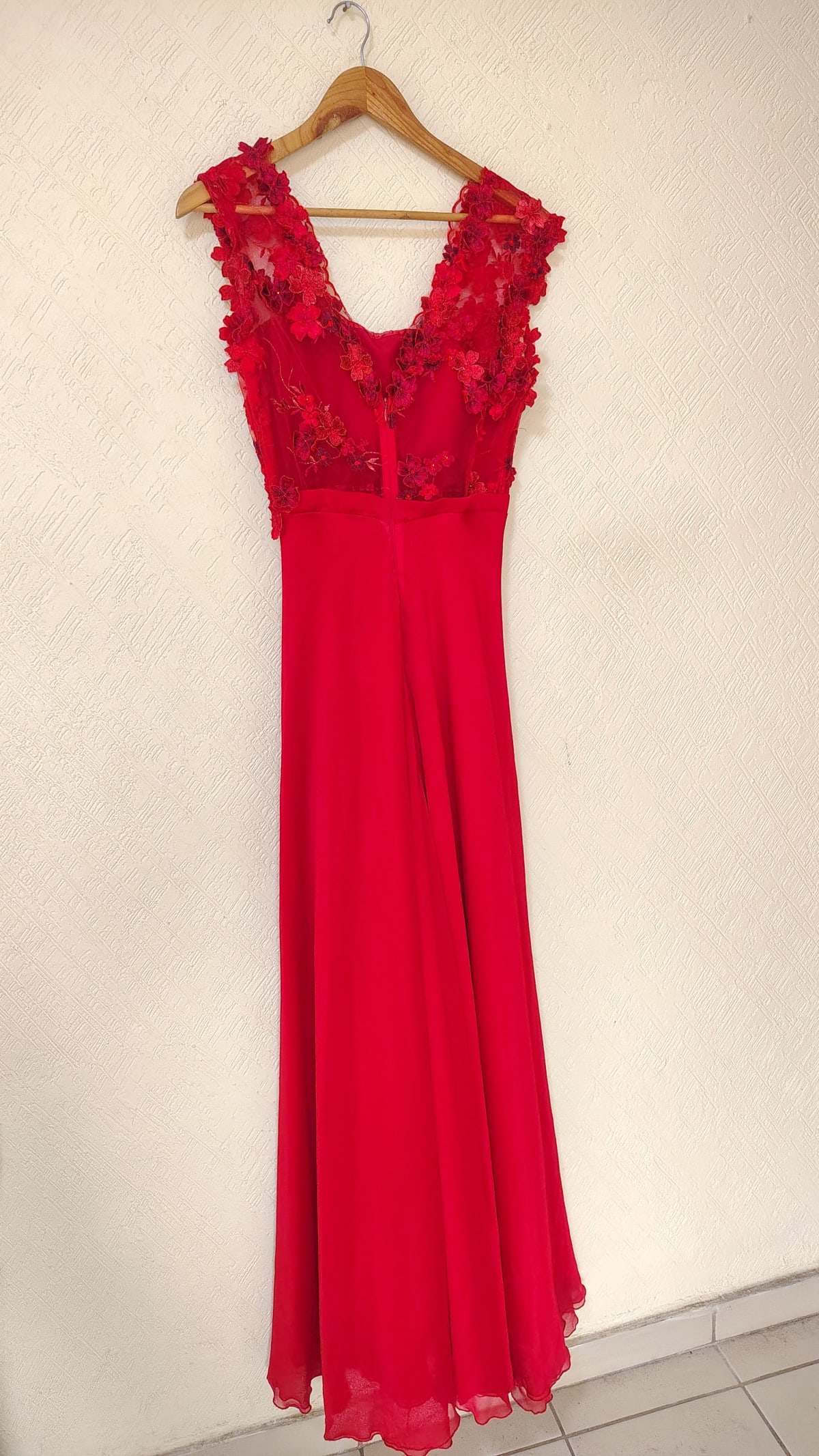 Hermoso vestido largo en color rojo, ideal para ocasiones especiales. Presenta un diseño elegante con detalles florales en la parte superior. El vestido está en buen estado, sin manchas visibles ni daños. Tiene una abertura en la pierna que añade un toque moderno.