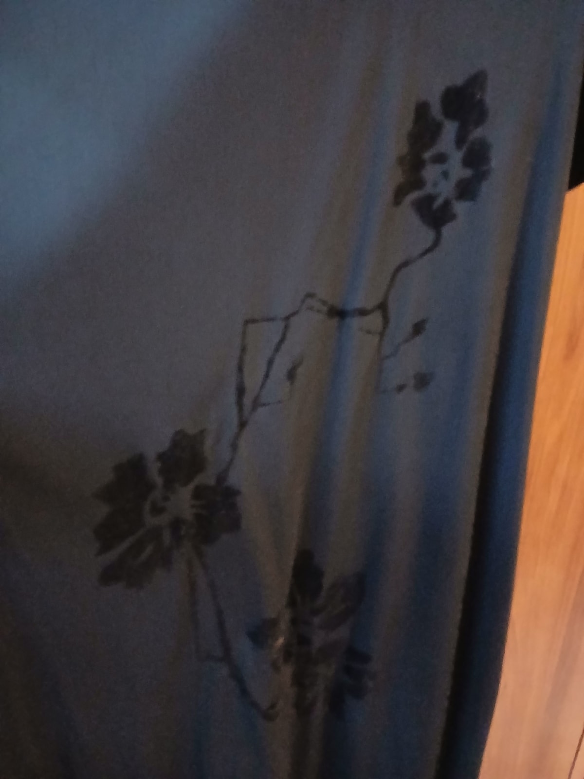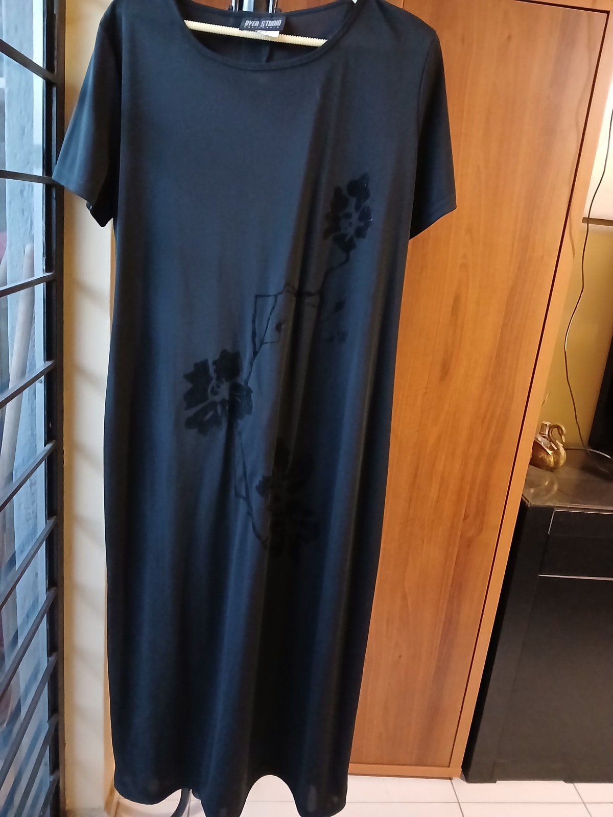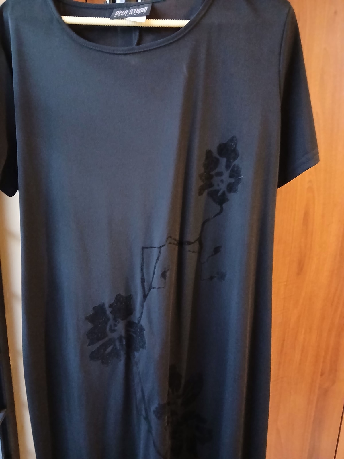 Vestido negro de manga corta en buen estado. Presenta un diseño sencillo con un detalle floral en la parte frontal. Ideal para ocasiones casuales y cómodas. Sin accesorios visibles y sin defectos notables, talla 16.