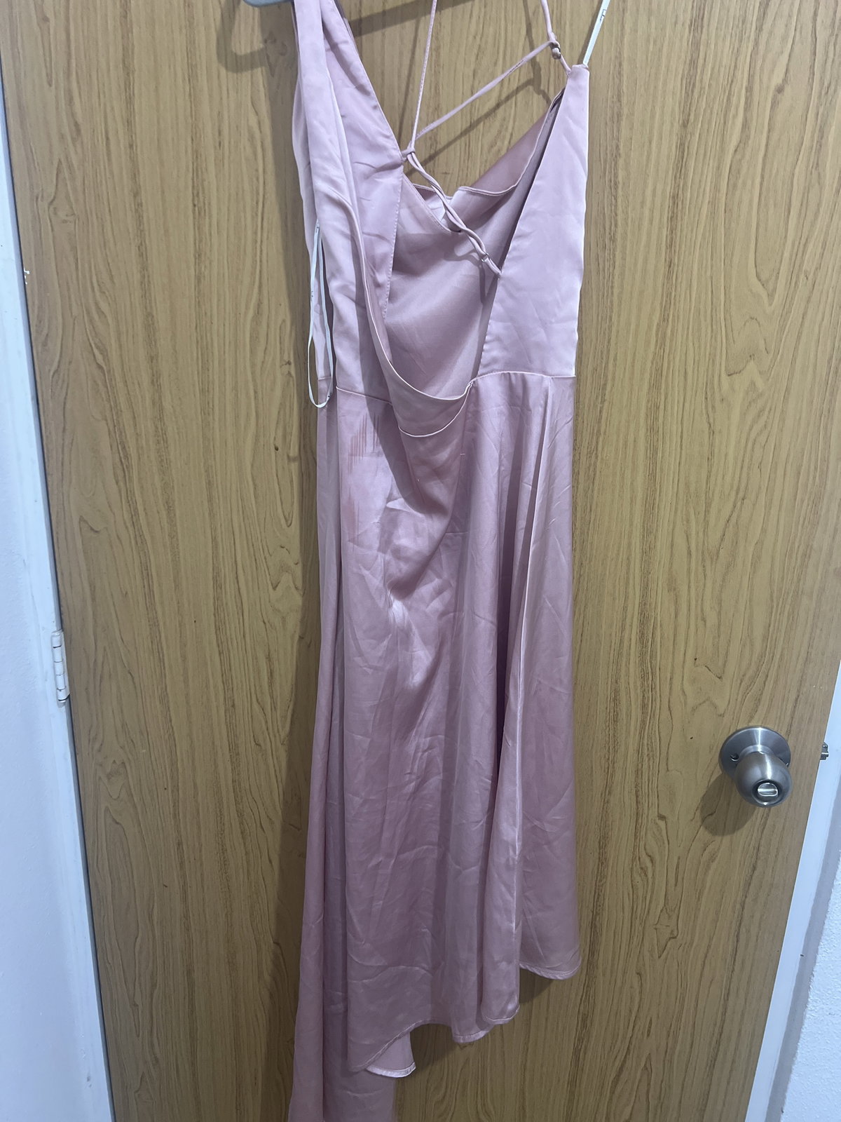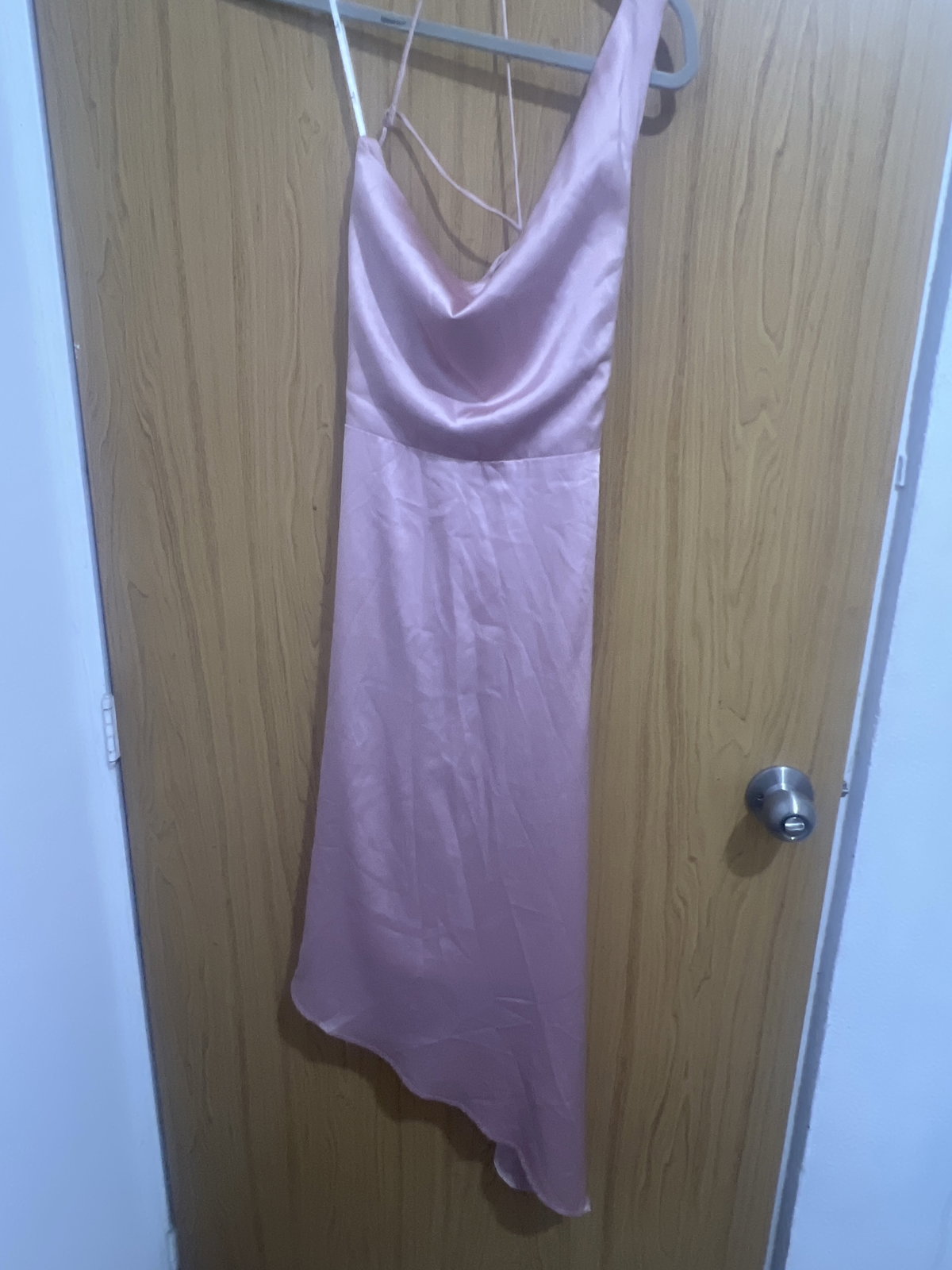 Vestido satinado de color rosa palo en excelente estado. Tiene un diseño elegante con tirantes delgados y un corte asimétrico en la parte inferior. Ideal para ocasiones especiales o salidas nocturnas. Sin manchas ni defectos visibles, listo para usar.