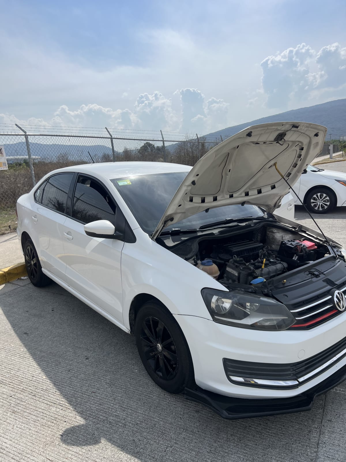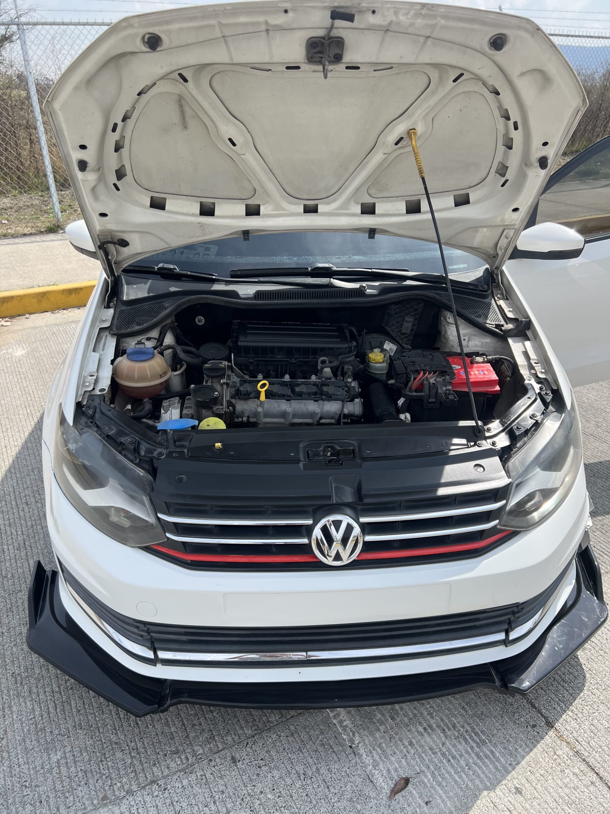 Vendo Volkswagen Vento 2017, color blanco, con detalles estéticos como un lip frontal. El auto está en buen estado general, con mantenimiento al día. El motor se ve en buenas condiciones y no presenta fugas visibles. Tiene cristales polarizados y llantas en buen estado. Ideal para quienes buscan un auto económico y confiable.