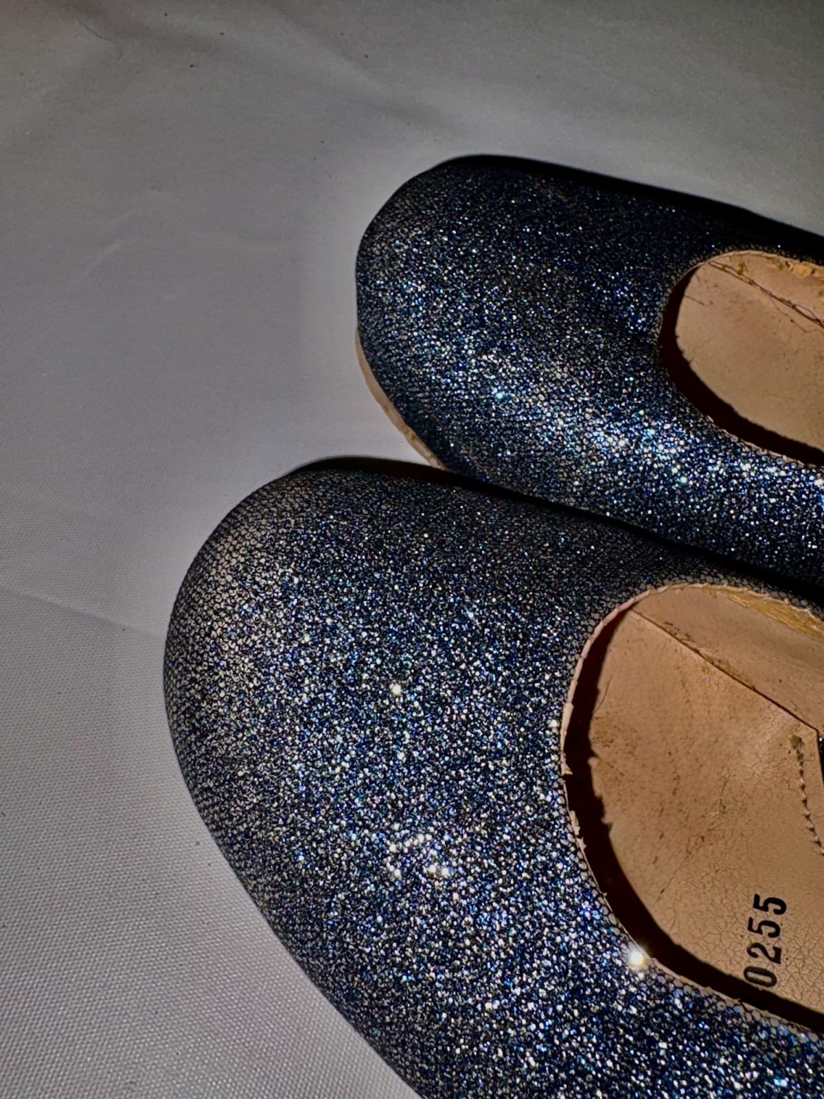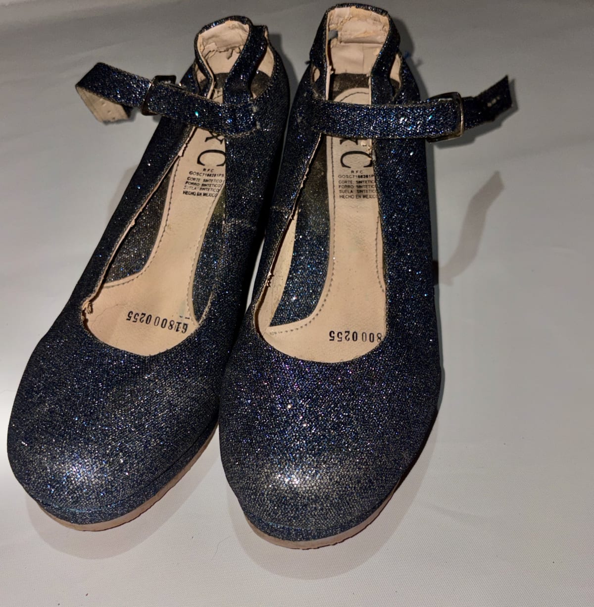 Zapatos de charol en color negro con destellos brillantes. Presentan un diseño elegante con tira ajustable. En buen estado, aunque se observan algunos signos de uso en la parte interior. Ideal para ocasiones especiales o eventos formales.