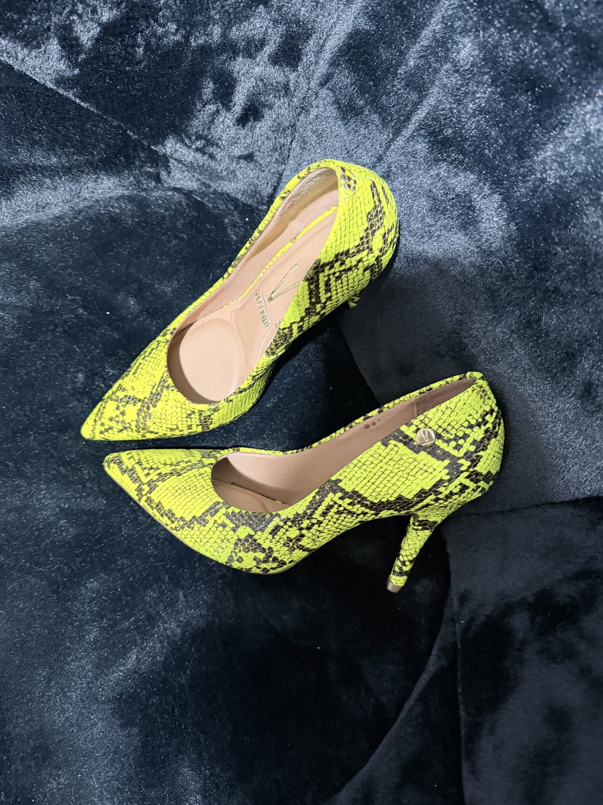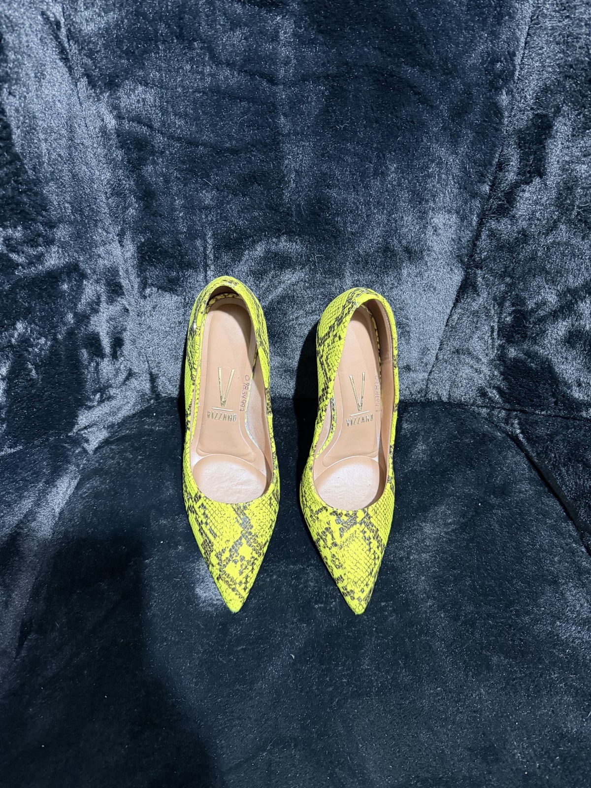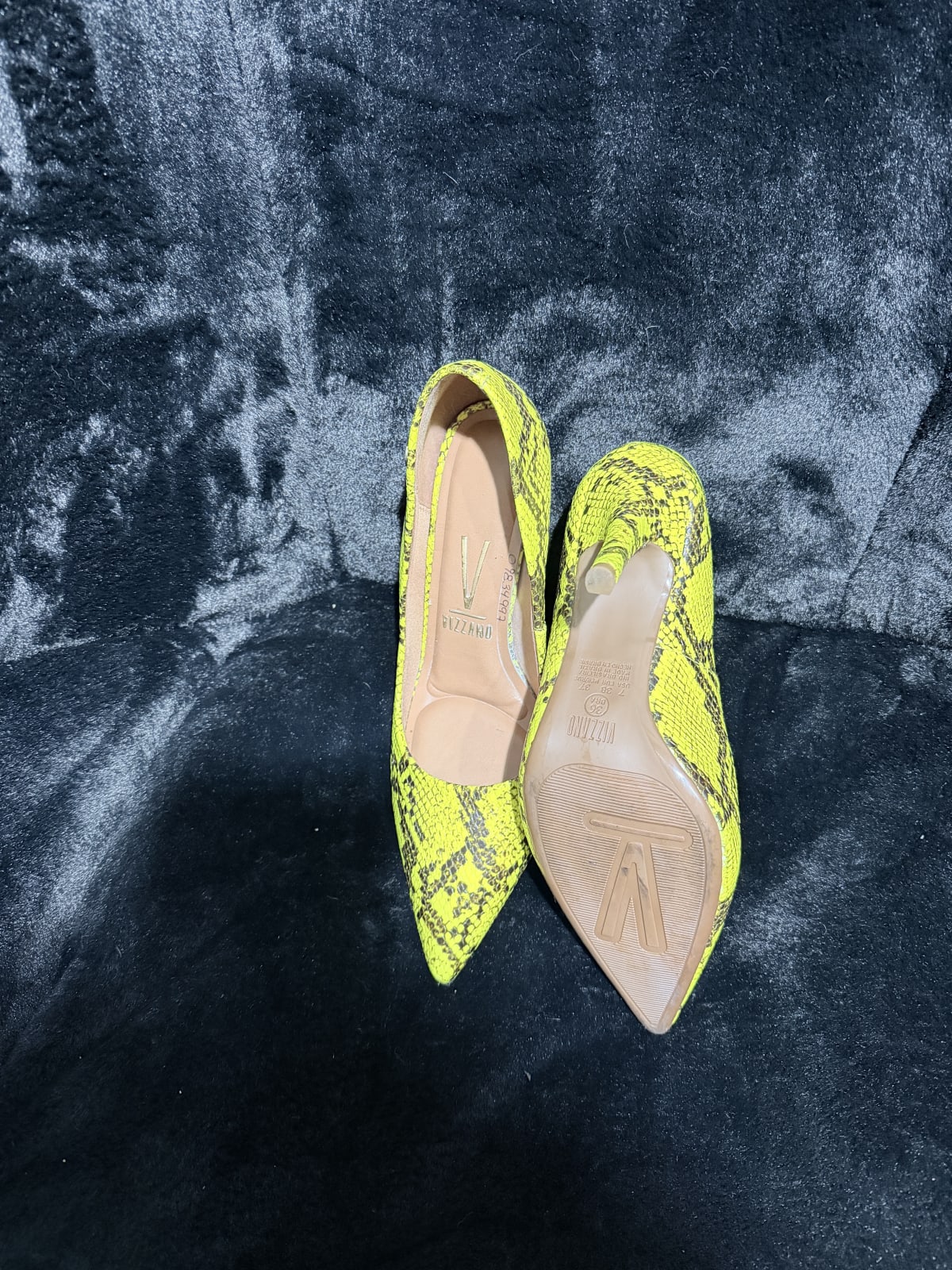 Estos elegantes zapatos de tacón tienen un vibrante diseño de serpiente en tonos amarillos y negros. Están en buen estado, con un uso mínimo visible. Perfectos para ocasiones especiales o para darle un toque único a tu outfit. Talla y marca visibles en la plantilla.