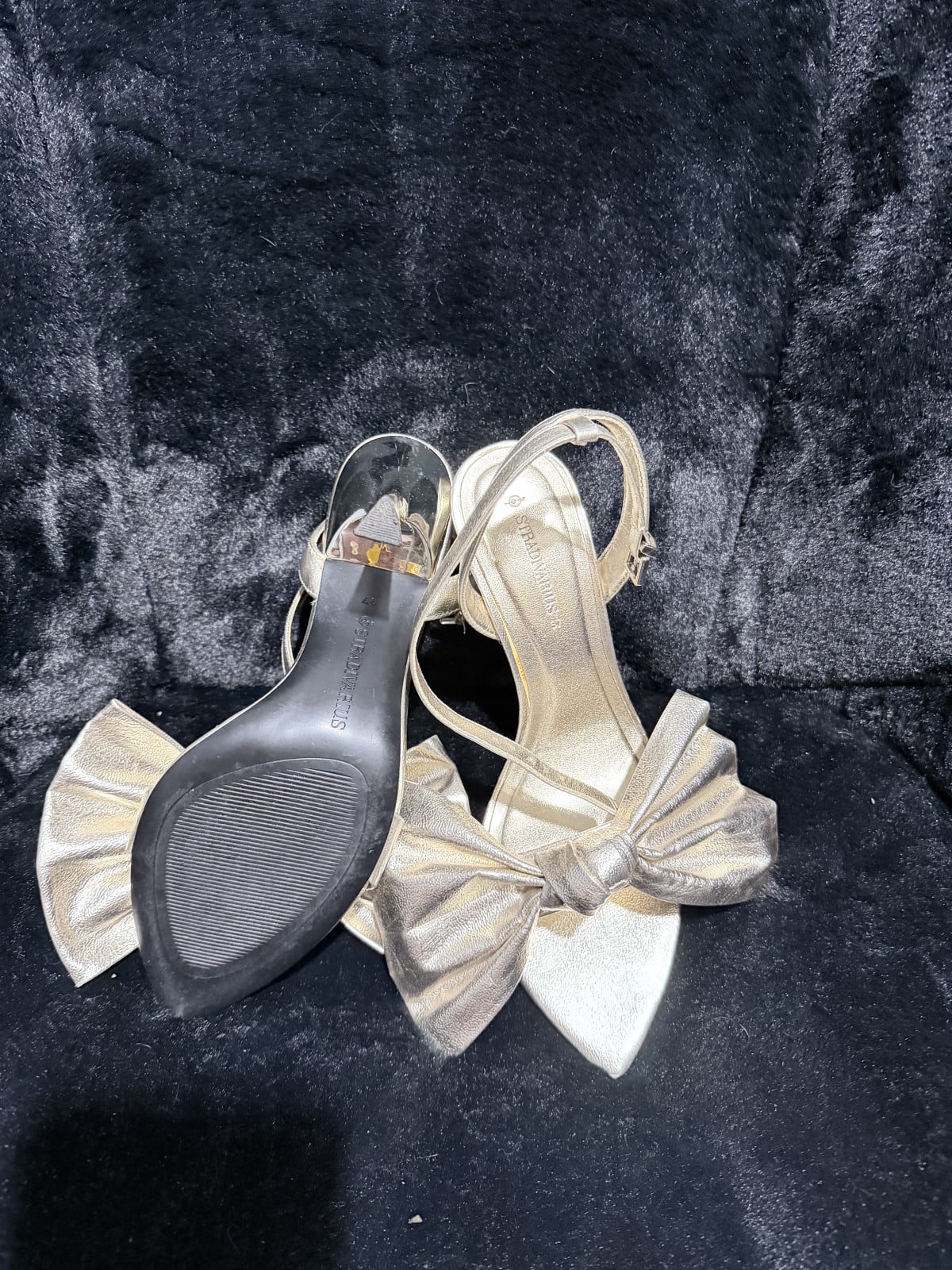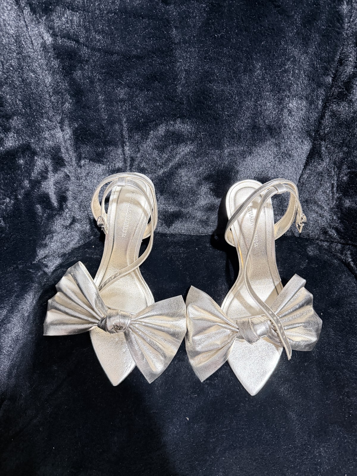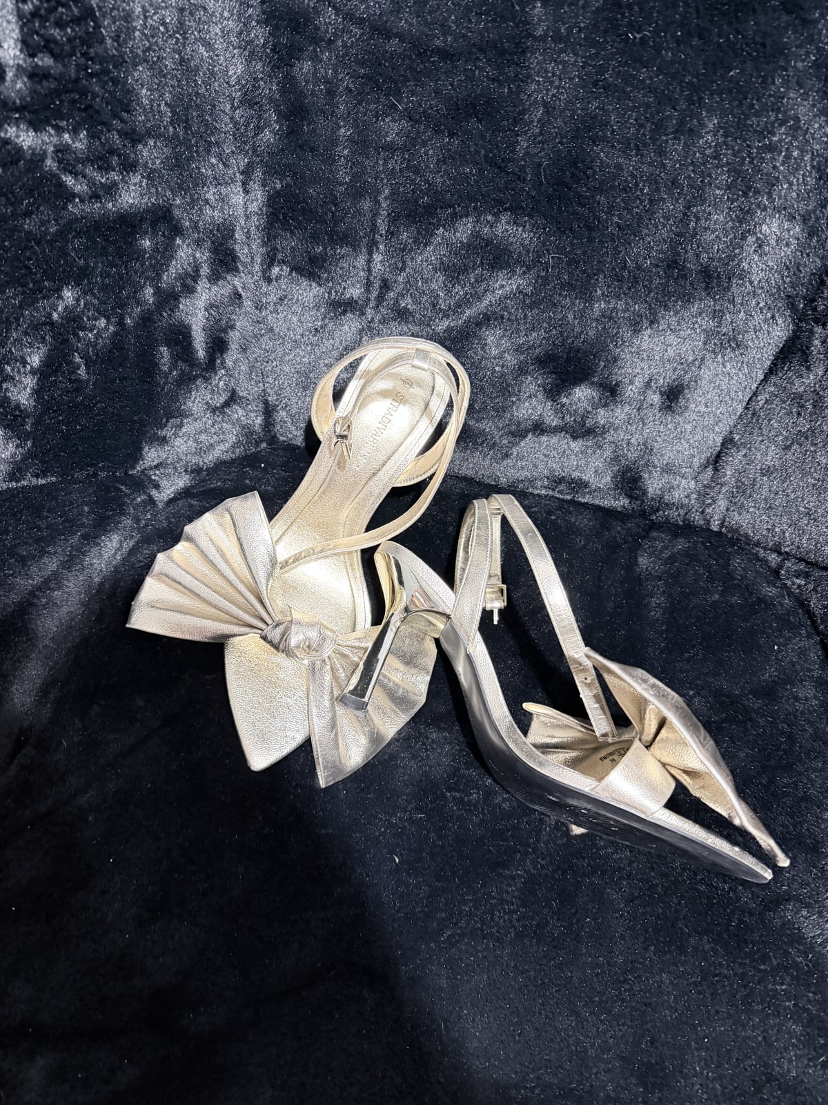 Hermosos zapatos de tacón en color dorado, ideales para ocasiones especiales. Tienen un diseño elegante con un lazo en la parte delantera. Están en buen estado, con signos mínimos de uso en la suela. Perfectos para complementar cualquier outfit de fiesta.