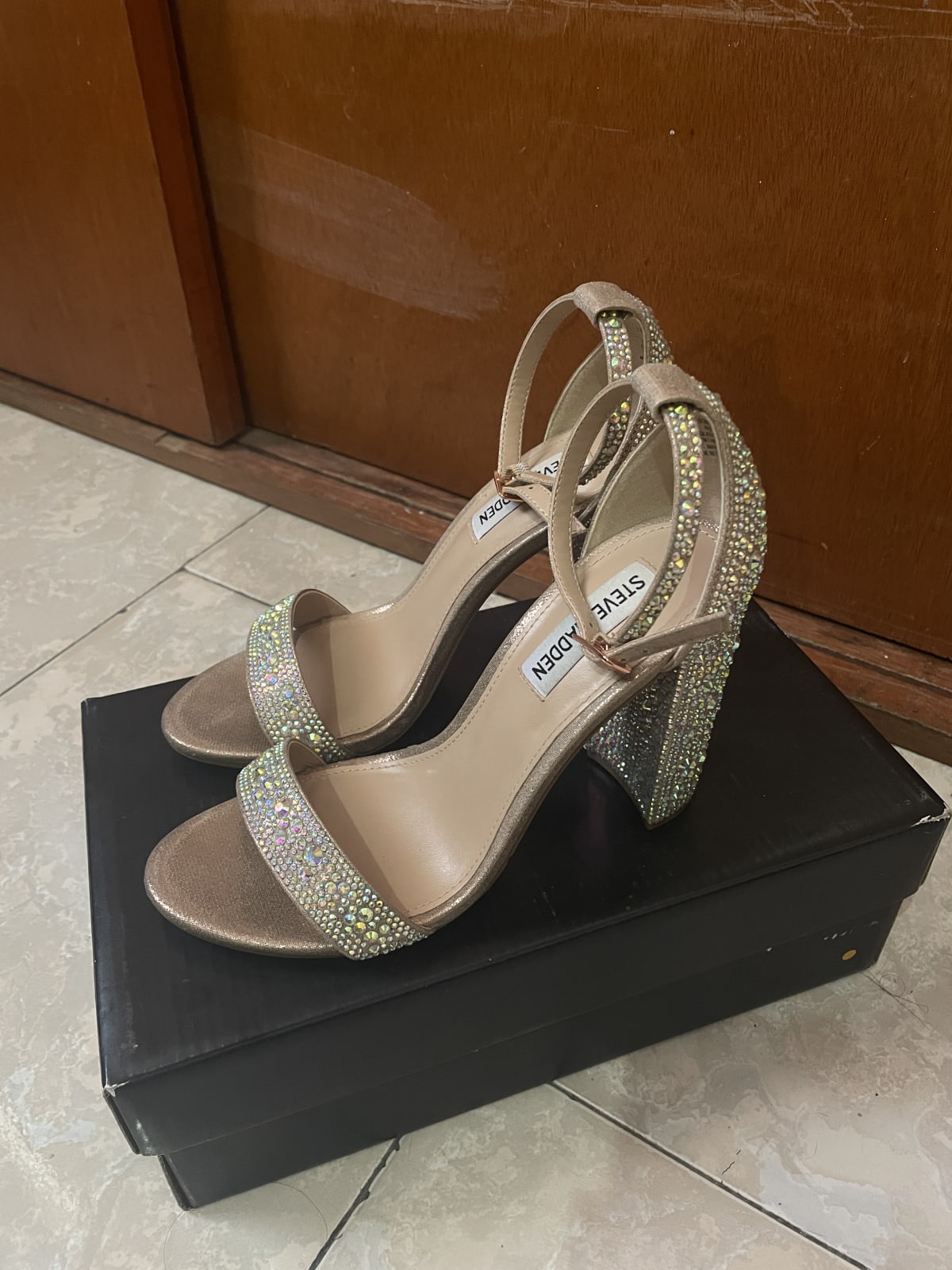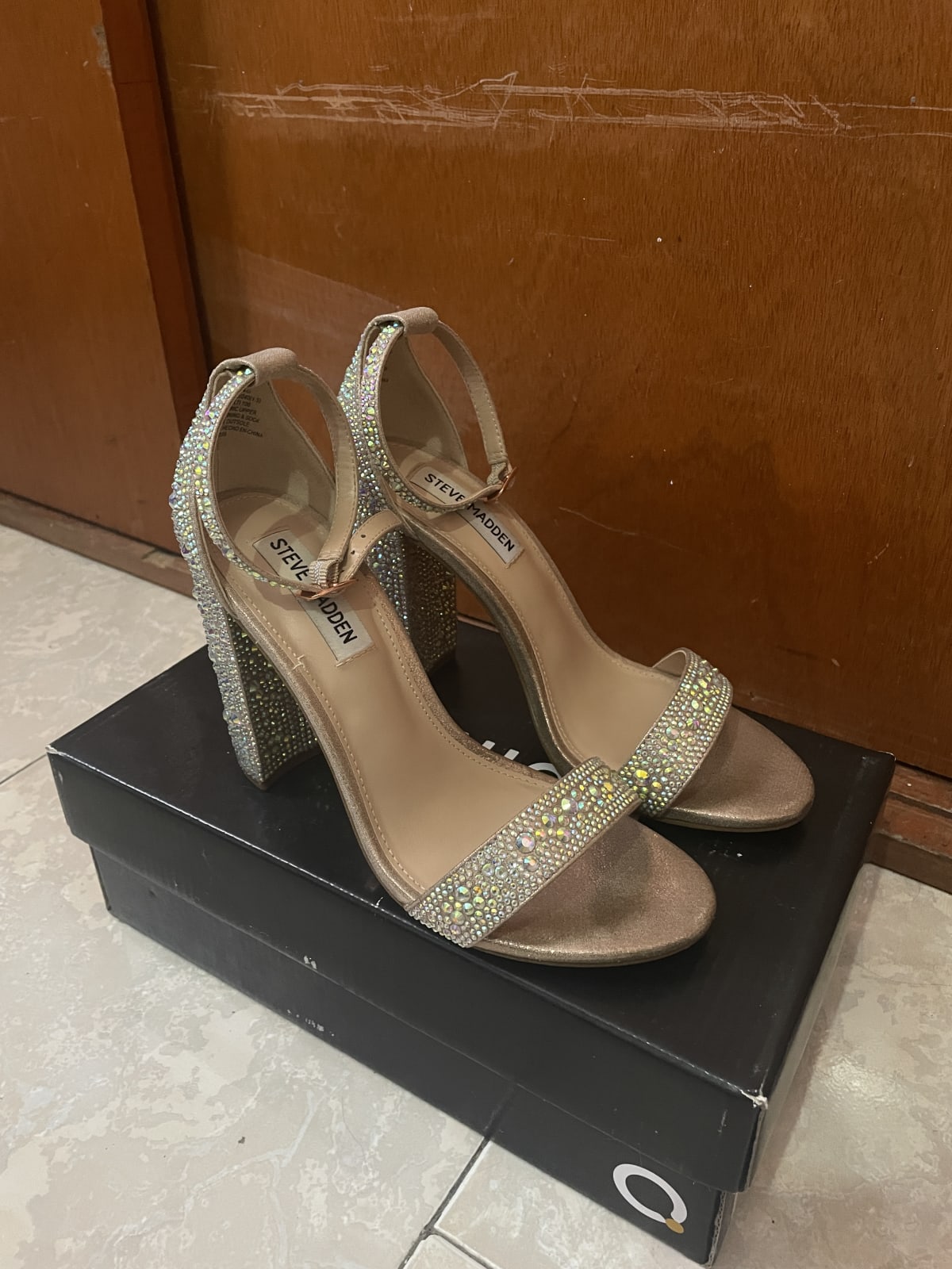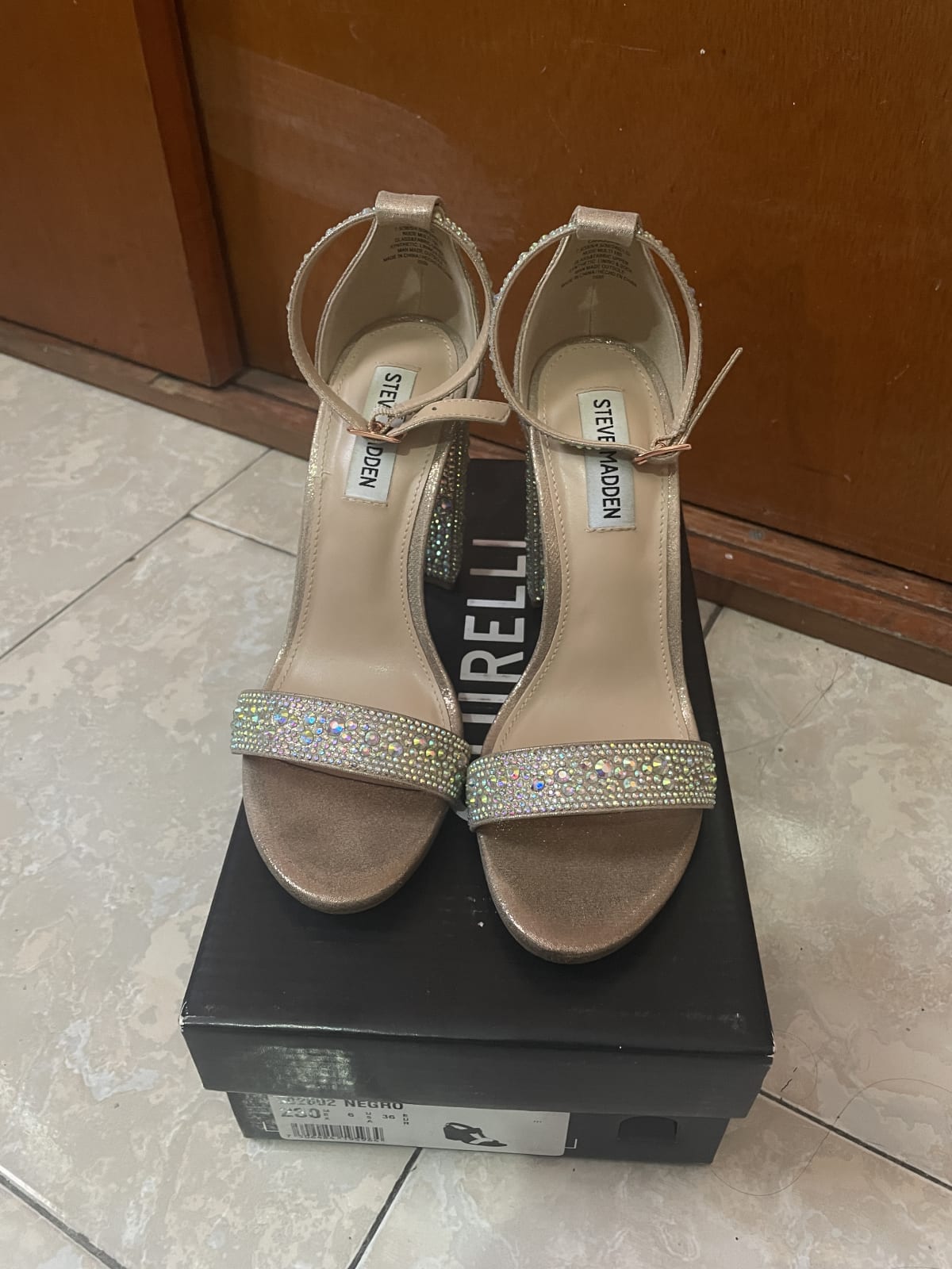 Hermosos zapatos de tacón de la marca Steve Madden, en color nude con detalles brillantes. Están en buen estado, con un ligero desgaste en la suela. No incluye su caja original. Ideales para ocasiones especiales o eventos formales. Fueron usadas en 3 ocasiones.